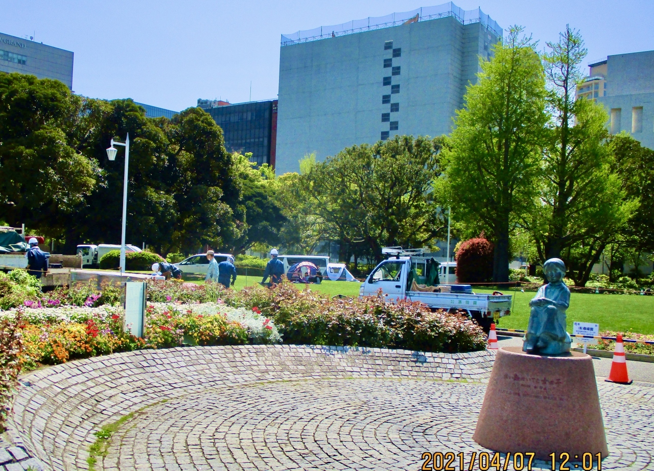 山下公園の中にありました。子供の頃いつも口ずさんでいた思い出の童謡で、大人になるとなんと悲しい曲だったのかと感じました。この日は、ローズウイークの準備で銅像の周りには作業をしている方が沢山いました。バラが咲いたら女の子も喜ぶでしょう。