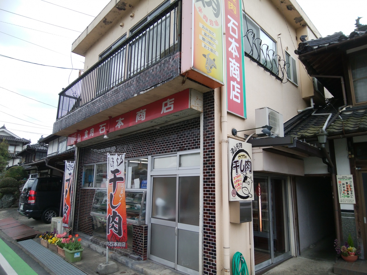 通常の精肉店だけでなく、干し肉の専門店だ。通販もある。個人的な話だが、この店で干し肉というジャンルがこの世に存在することを初めて知った。牛肉の干し肉というとビーフジャーキーを想像するものの、調理後の実際はかなり生に戻して食べるという感じだ。生物を乾すというと魚の干物を連想するが、実際は魚よりももっと生々しいものだ。とはいえ、乾すことによって味が濃厚になる点は一緒だろう。乾すという作業によってうまみが増すのは魚も肉も一緒だ。この日は牛の干し肉のほか、鶏の干し肉も買った。牛もさりながら鶏がいけた。鶏肉の調理法はいろいろあるが、こんな味わいが増す方法はなかなか知らない。ショップがあるのは吉井川の北側一帯で、周囲には同業者が点在している。店によって味が違うのだろうか。JR駅からは少し離れているが、車の駐車場は完備している。
