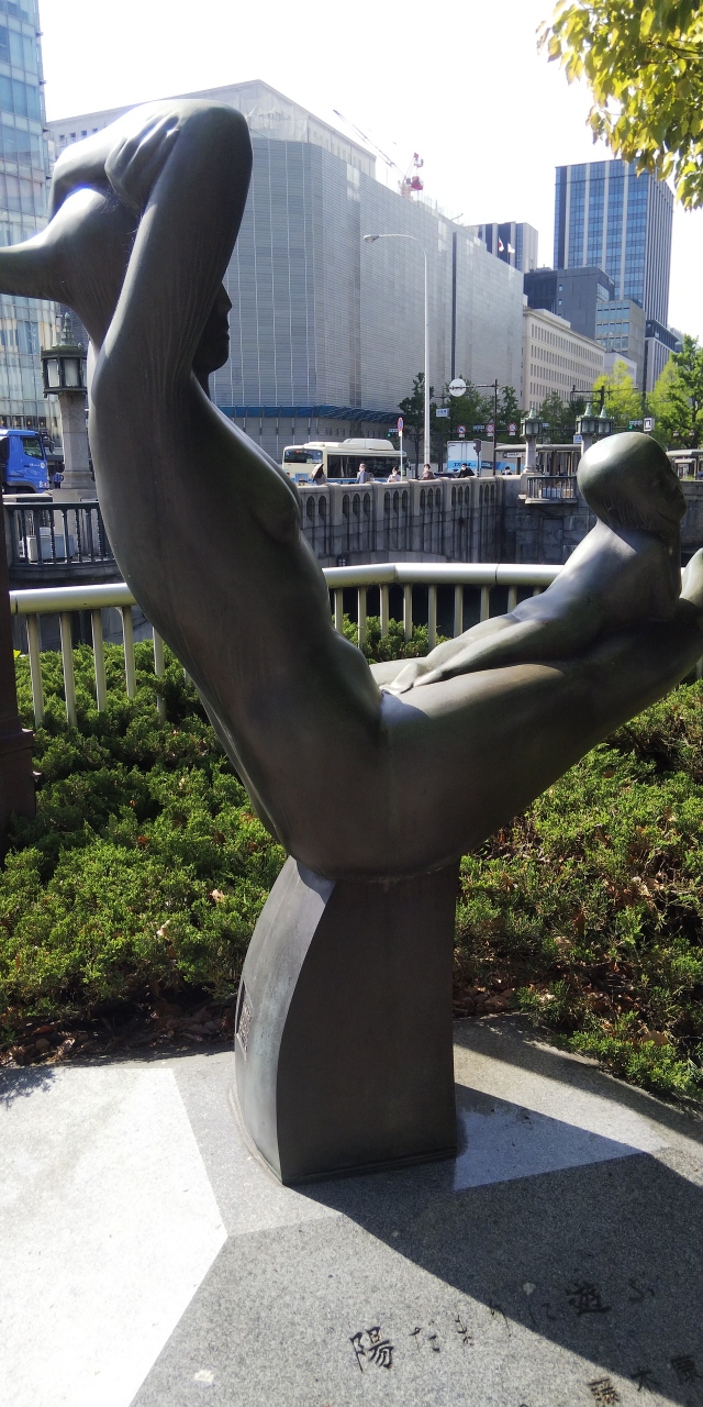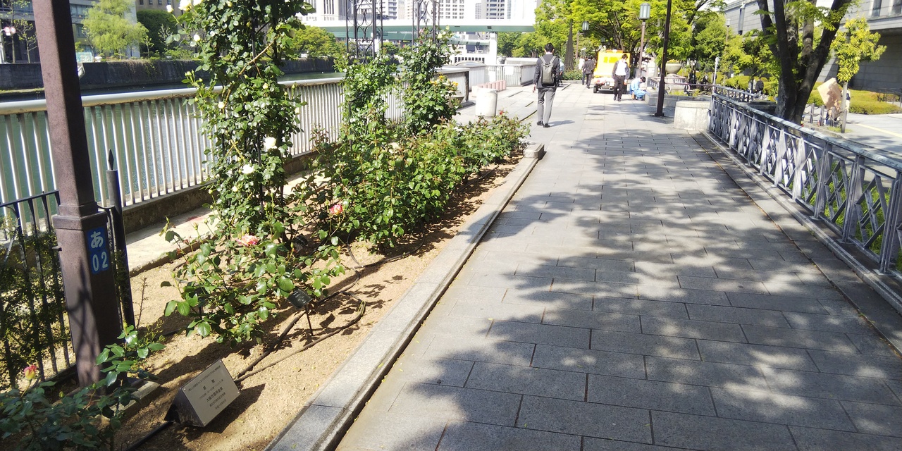 中之島公園の中之島緑道は土佐堀川沿いの淀屋橋から肥後橋までの区間です。道沿いには、ケヤキやツツジなどの草木が植樹されておりまして、オシャレな彫刻が10体ぐらい設置してありました。写真のように歩行者または自転車の利用ぐらいです。