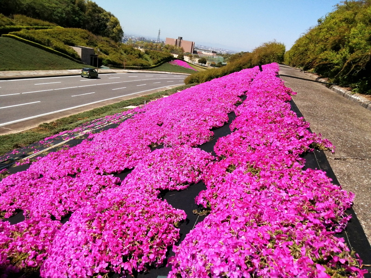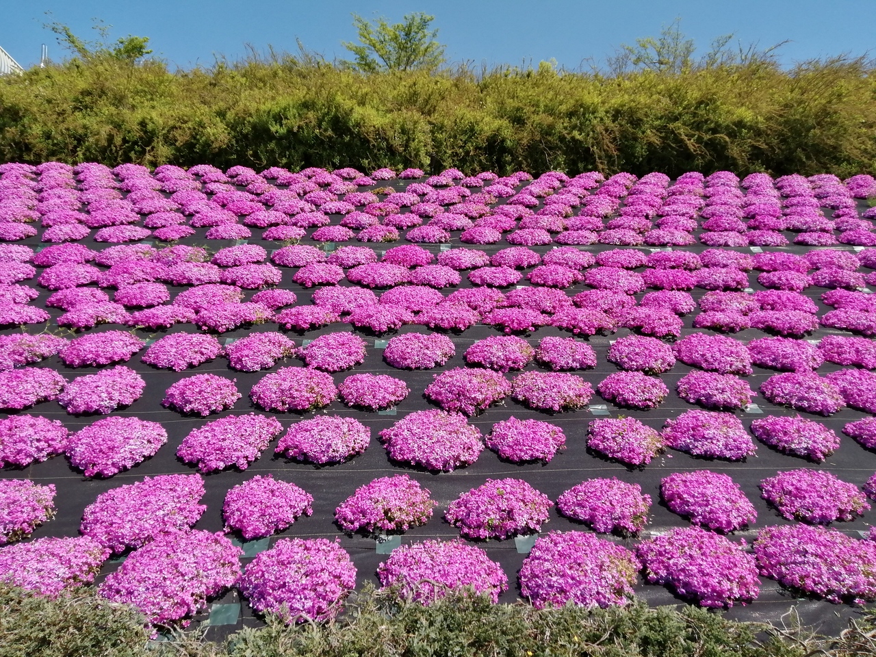 中総(岡﨑中央総合公園)の芝桜が咲いていると聞いたので見に行ってみました。中総の敷地は広大ですが芝桜が見られるのは野球場北側の道路沿いです。