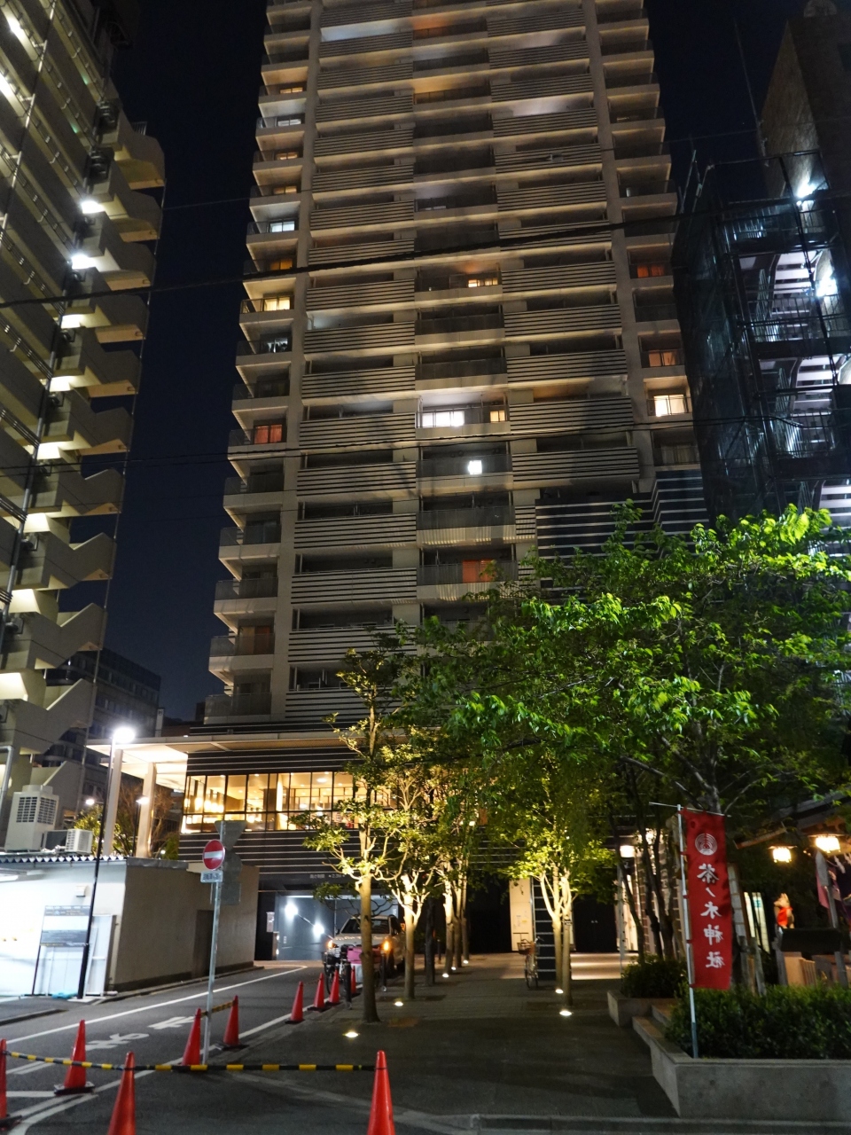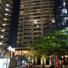 背後の高層マンションを望む光景が