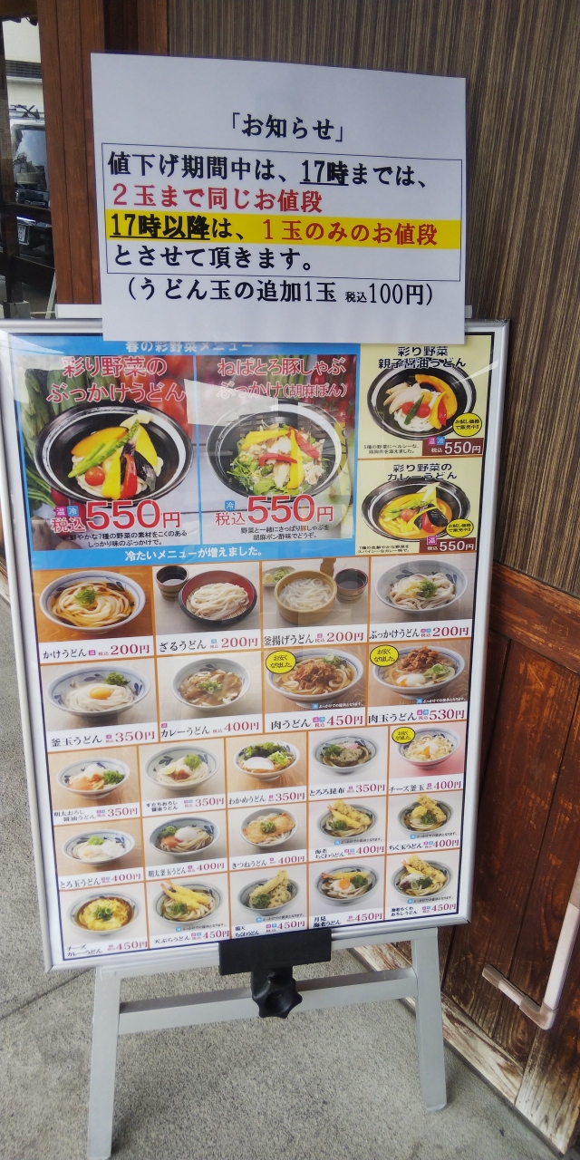 香の川製麺の福田店は堺市の国道310号線沿いにある店舗です。値下げと書いてありましたが、今までは麺3玉まで同料金だったのが、夕方までは麺2玉まで、さらに夕方以降は麺1玉までになっていました。我が家は麺3玉オーダーしていたので、実際は値上げかな。いろいろ厳しい世の中なので、値上げは致し方ないと思いますね。