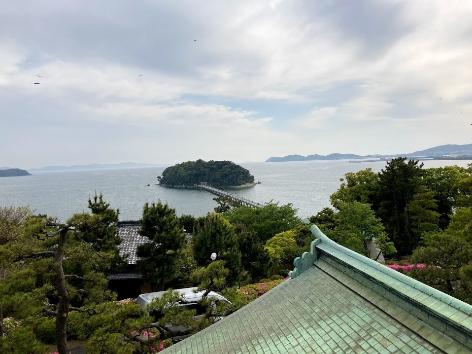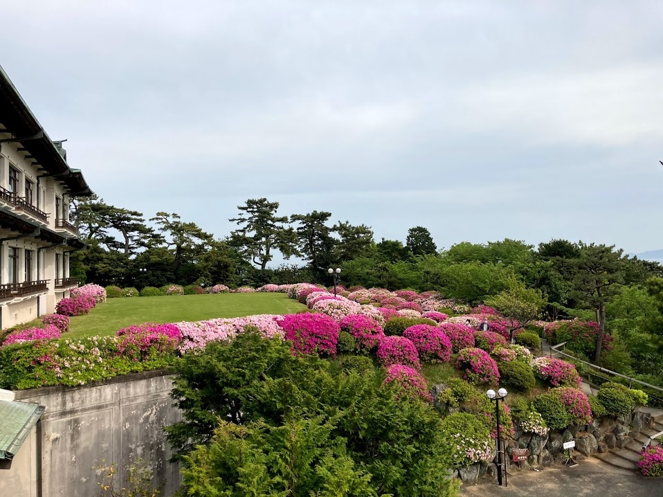蒲郡クラッシックホテルの2階にあるカフェラウンジで、テラス席もあり、竹島、三河湾の眺望が見事です。なおかつ、つつじの季節でしたので、中庭のつつじも綺麗で最高でした。
