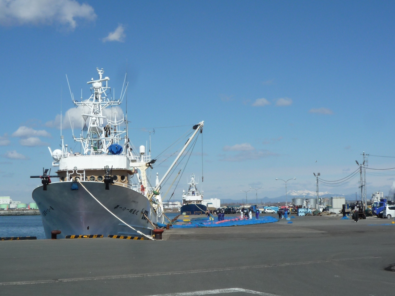 この季節はオフシーズンなので漁港の光景も穏やかです~、岸壁を歩いても風に吹かれることも無く静かで聞こえてくるのはカモメの鳴き声ぐらい…、天気が好いと背景に残雪が残る阿寒岳連峰が観えます。