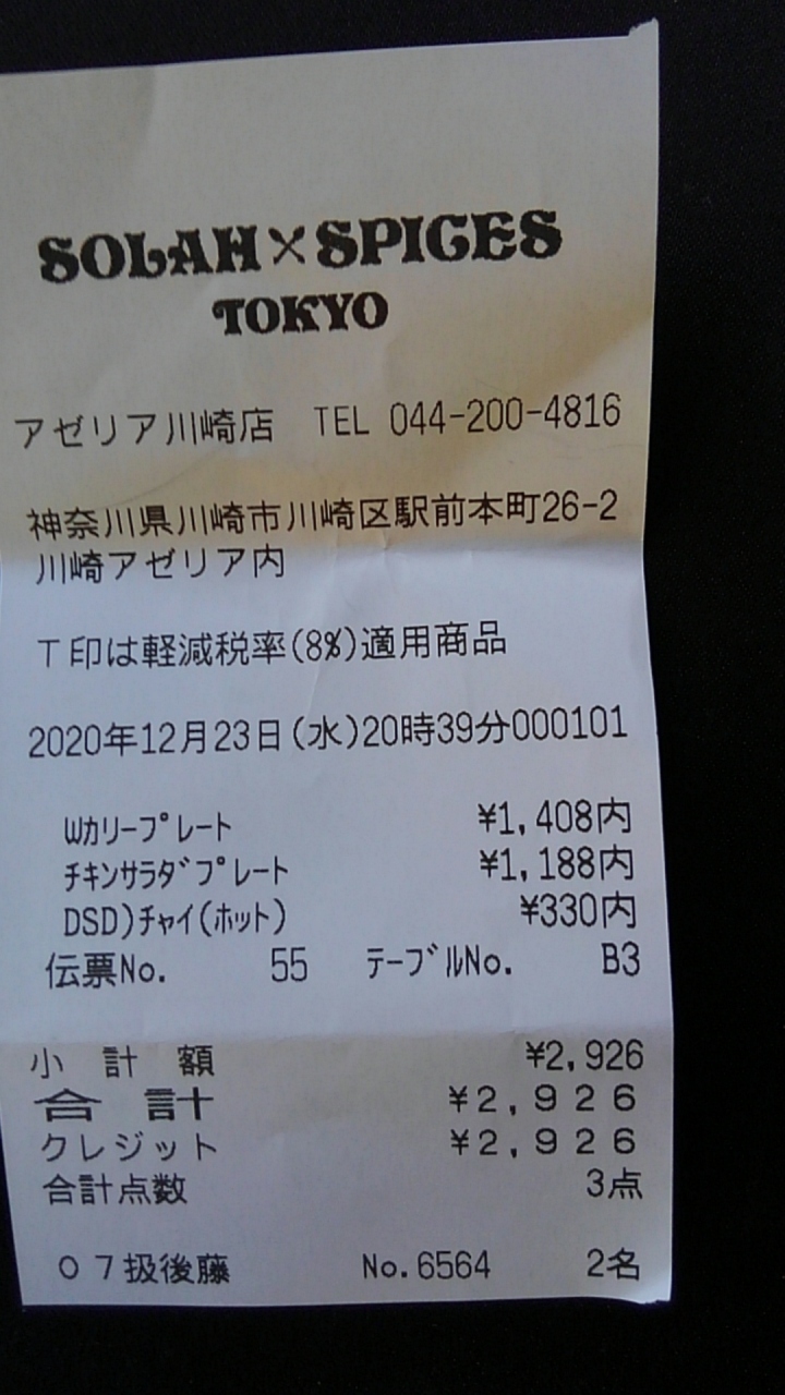 ソーラ スパイス トウキョウ 川崎アゼリア店、2度目の利用です。川崎アゼリアの中で夕飯を食べることになり、通路をフラフラしていたときに急にスパイシーな香りがしてきて、突然入ることに決まりました。スパイシーなカレーはやっぱり美味しいですし、最後に飲んだチャイも本当に美味しかったです。