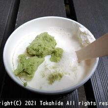 カップアイスにおろしたてのわさびをたっぷりと載せてくれるので、自分でかき混ぜながらいただきます。