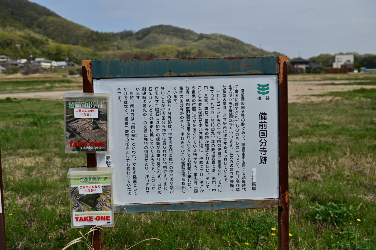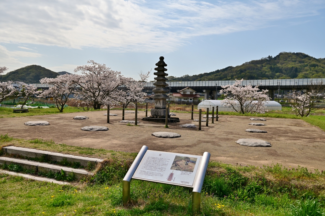 備前の巨大古墳である両宮山古墳の近くにある。古墳から仏教公伝を経て寺院が建てられた宗教の巨大な流れが実感できるような場所だ。とはいえ、現地には伽藍の説明図と塔の基壇が残るのみで、少し想像しにくい。広々とした跡地が保存されており、現地に立って目をつぶって想像してみよう的な場所だ。幹線道路から少し住宅街の狭い道を入った所にある。