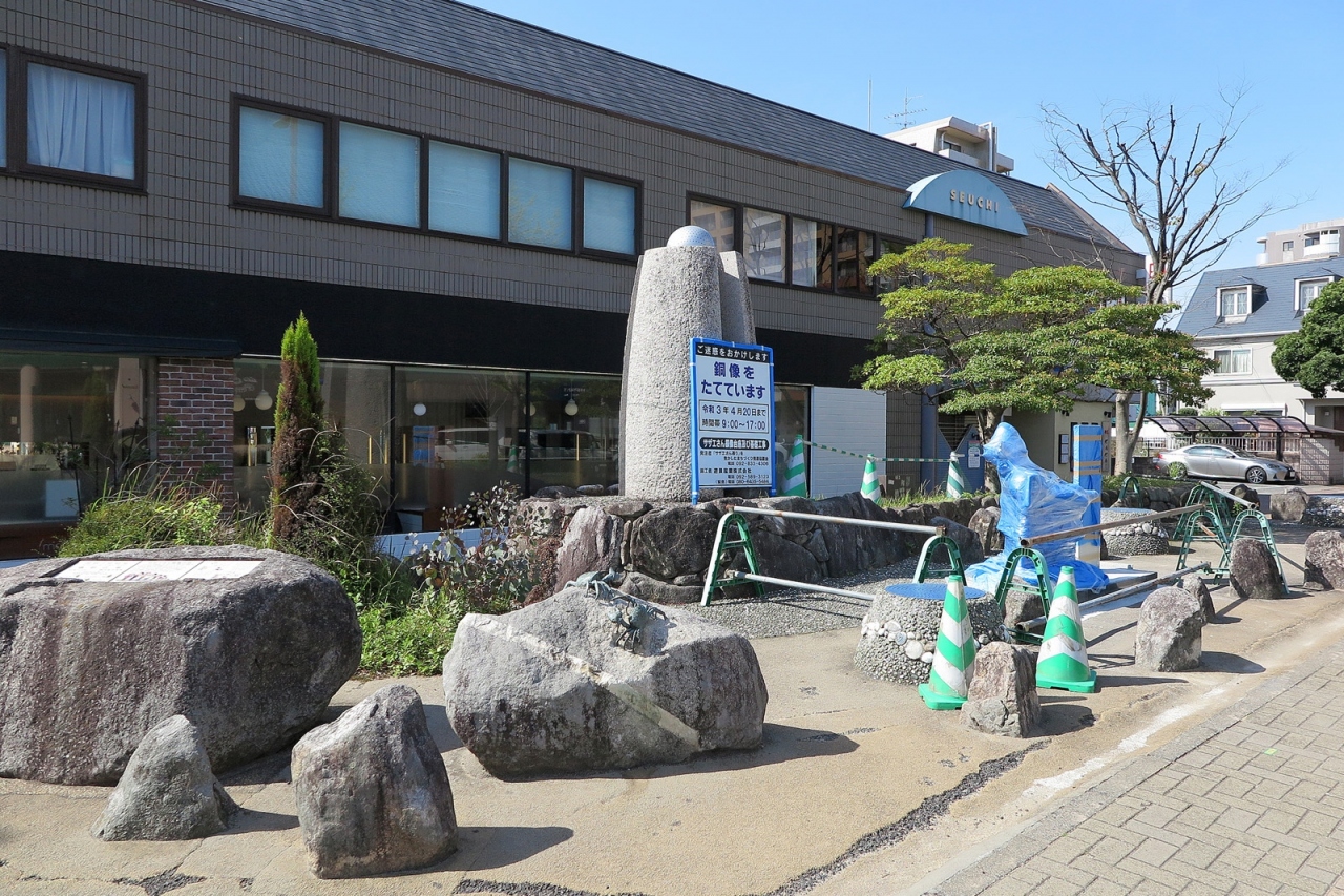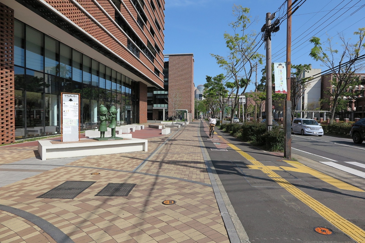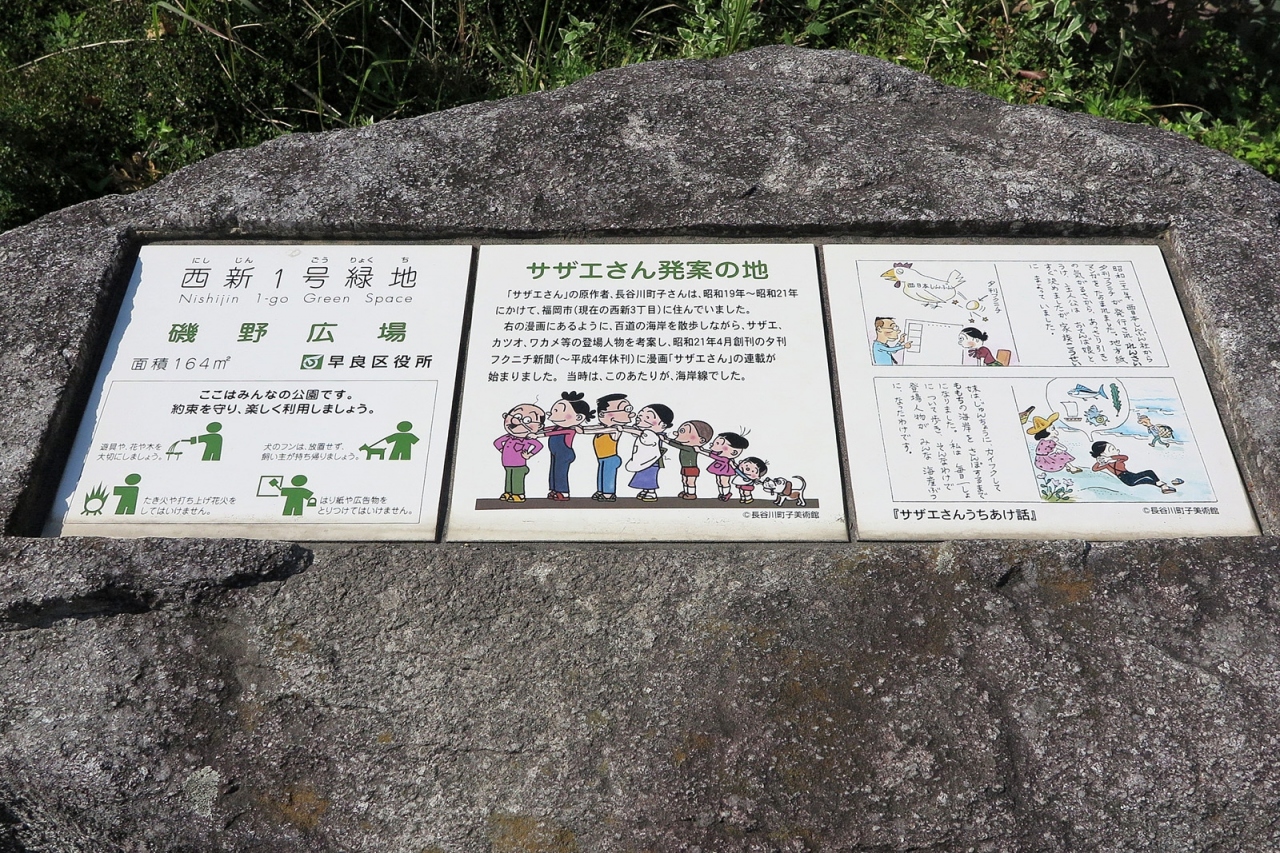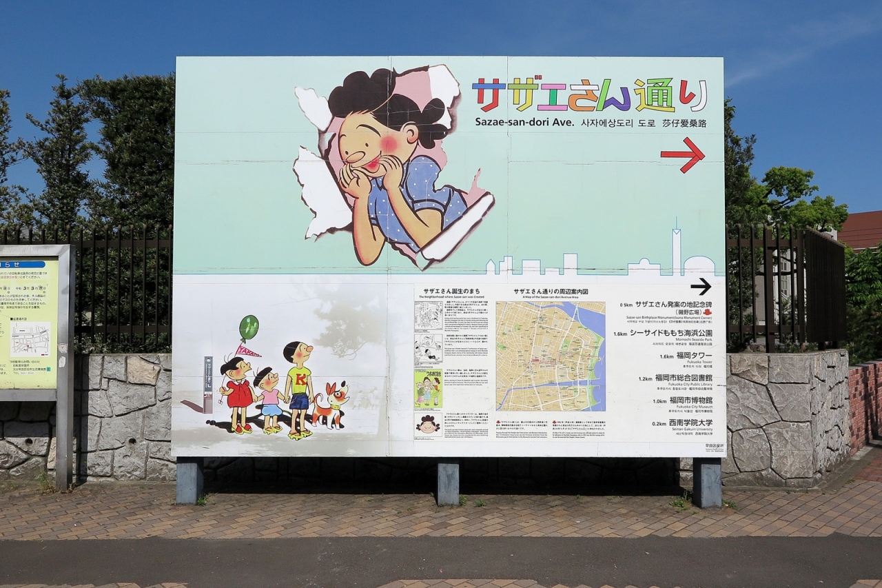 「西新」駅から「福岡市博物館」に向かうには「サザエさん通り」を通って行きます。通りの入口には修猷館高校がありますが、大学時代によく耳にした名前なので、やはり気になります。少し先の西南学院大学前には「町子先生とサザエさん」の像、突き当りの交差点にある「磯野広場」には「サザエさん発案の地」の碑がありました。4月11日現在、銅像建設中でした。今回はここまででしたが、次回は通りを最後まで貫通したいと思います。