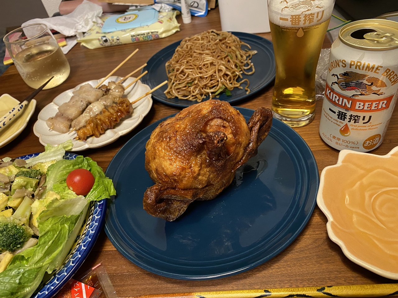 光が丘のショッピングセンターに新しくできた惣菜屋さんです。大山にもある焼き鳥がメインのお店です。この日はフットサル帰りに立ち寄り。全品半額のタイミングでしたが、なんと丸ごとチキンも半額。夫婦で豪快にほおばりました。