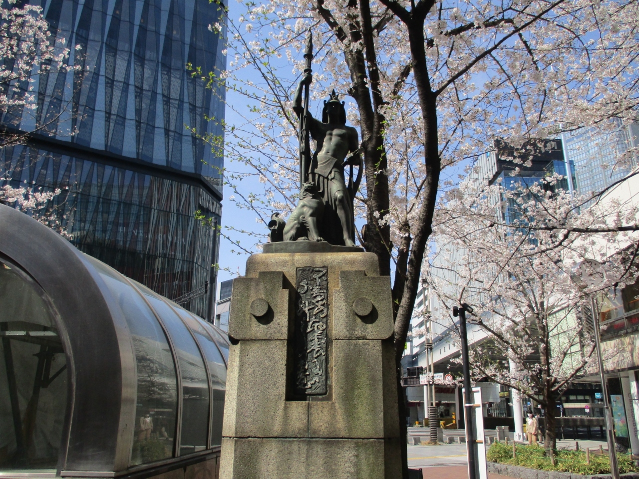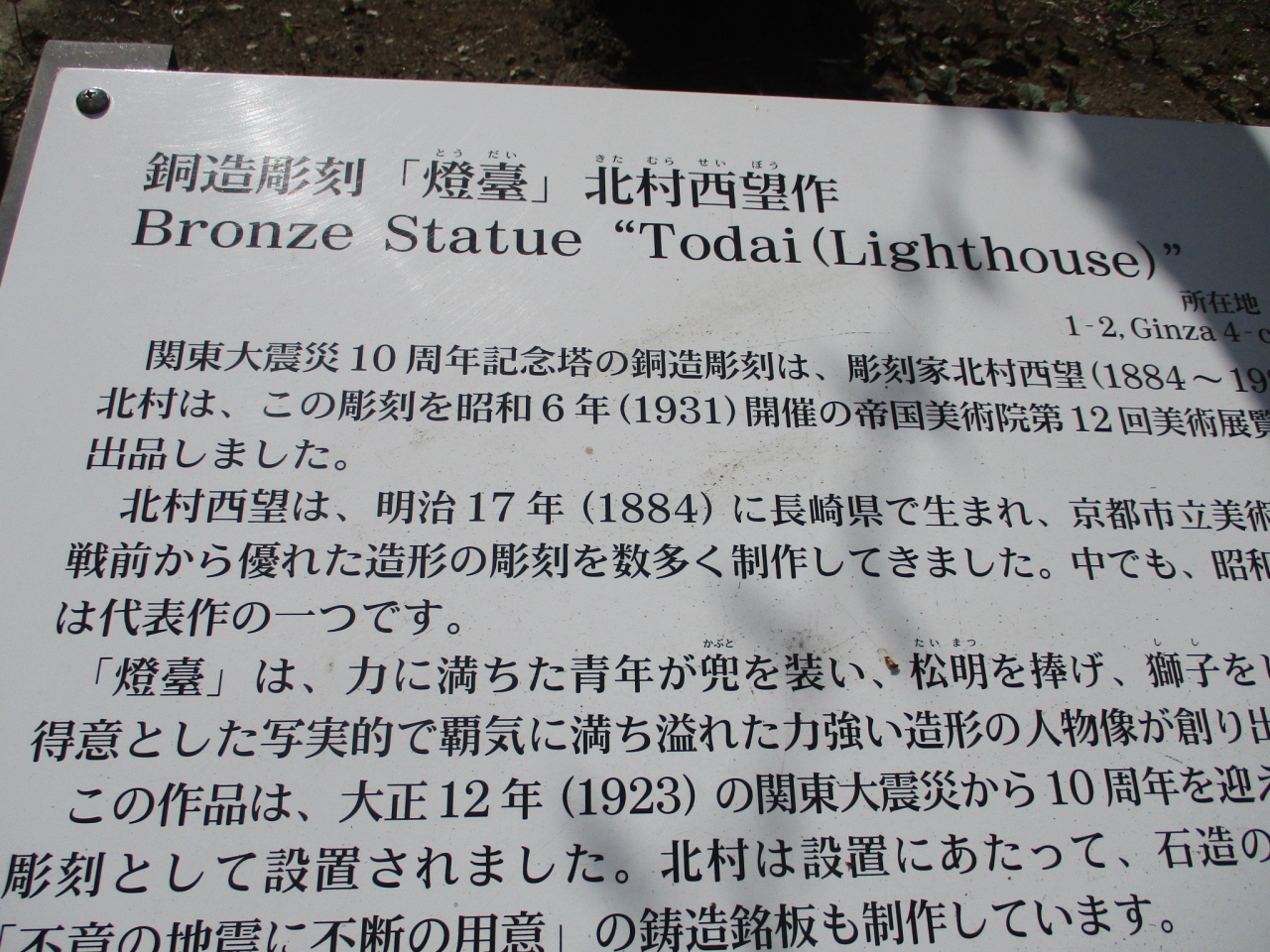 有楽町駅近くの数寄屋橋交差点の近くに碑があります。高い台座の上に兜をかぶった青年と獅子の凛々しい姿です。北村西望という彫刻家によって造られたものだそうです。最初碑の読み方がわかりませんでした。小さくふりがながあったのでよかったです。