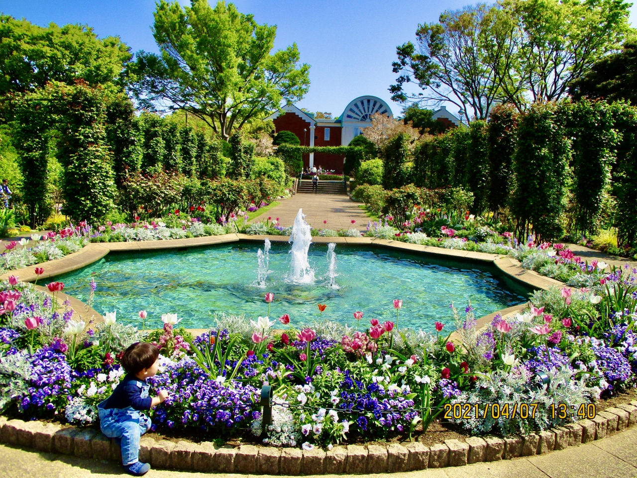 4月7日に行きました。5月3日からローズウイークが始まりますが、ガーデンネックレスというイベントを開催中で、色々なお花で綺麗に飾られていました。この辺りが香りの庭で、ローズガーデンと共に薔薇が咲き乱れるのが楽しみです。