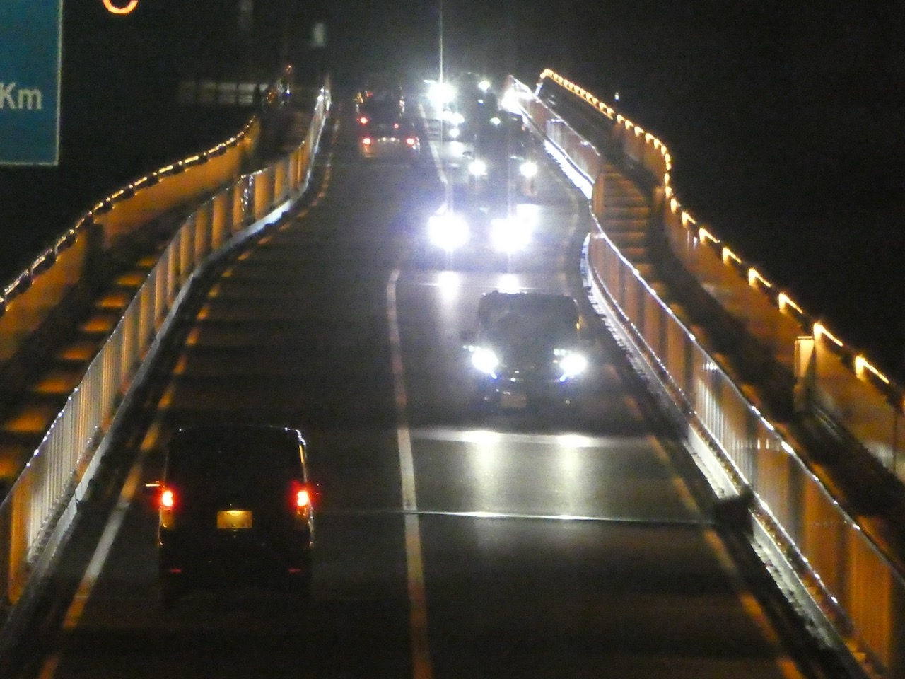 なお、眺めて楽しむ橋としても真ん中のアーチ部分は250mもあってコンクリート橋としては長い方です。縦方向だけでなく横方向にも優美できれいな橋です。なお通過時間が夜だったので、横からは灯の列しかみることができずそれが残念でした。