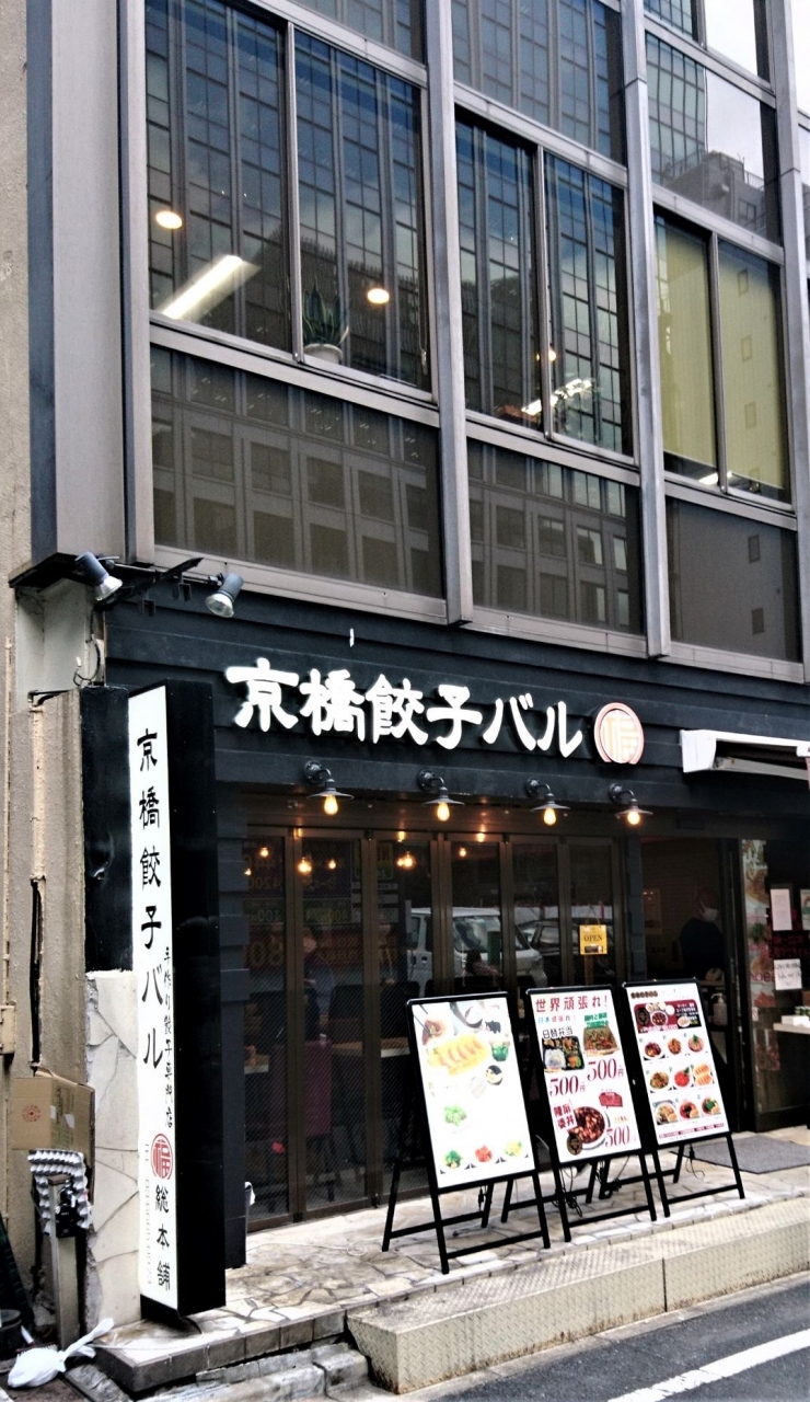 八重洲南口から京橋方面に向かう有名な焼鳥店伊勢廣がある小路にある餃子がメインにした中華居酒屋。以前はイタリアンレストランがあった路面の店。この餃子バルはちょっとお洒落な町中華でランチもやっていて、テイクアウト弁当も売っている。
