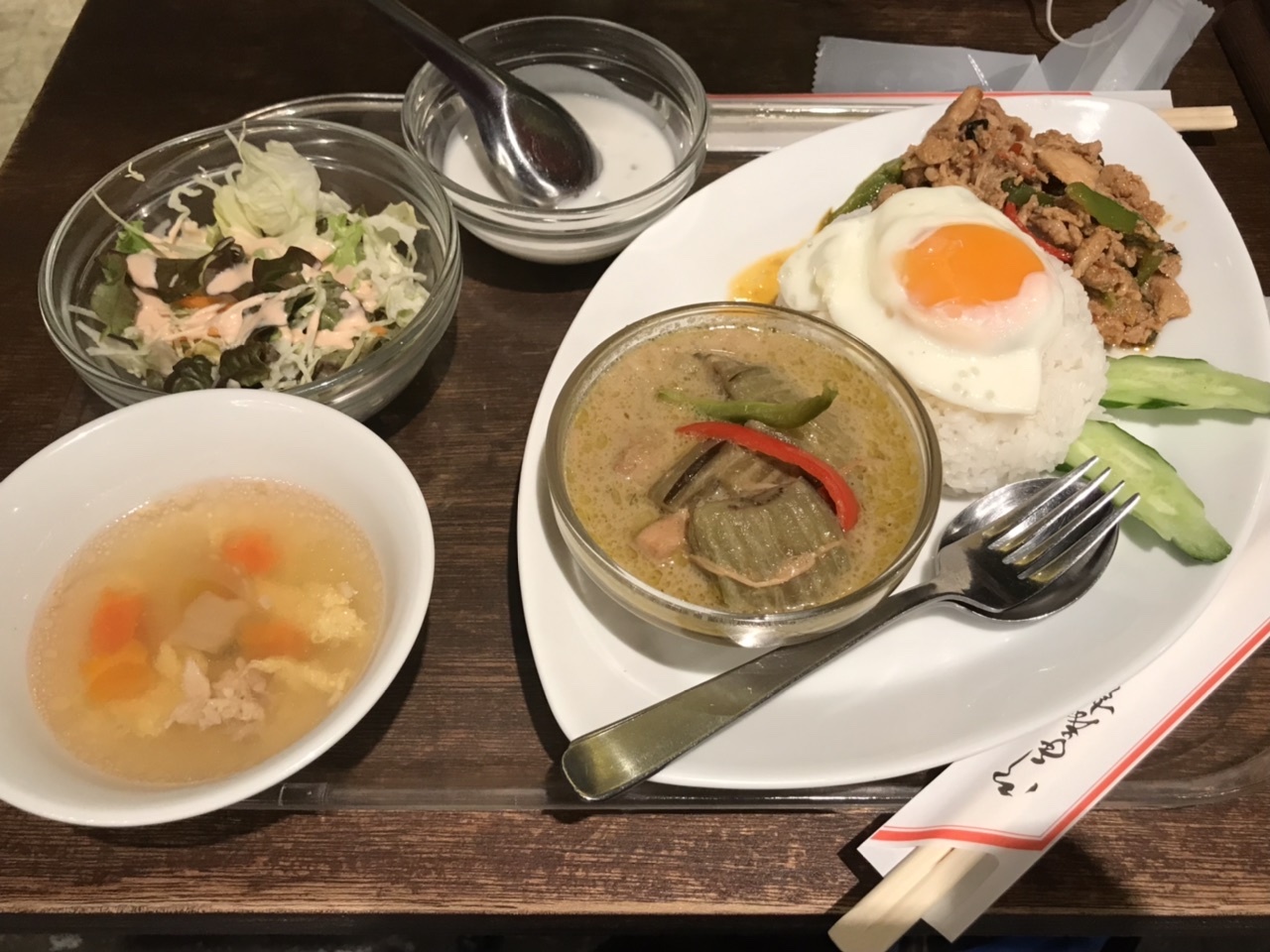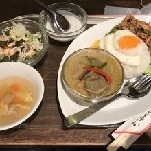 鶏ガパオとグリーンカレーのセットをいただきました。ライスに目玉焼きも載っており、おかずがたくさんな感じです。定番のタイ料理ばかりですが、美味しくいただきました。