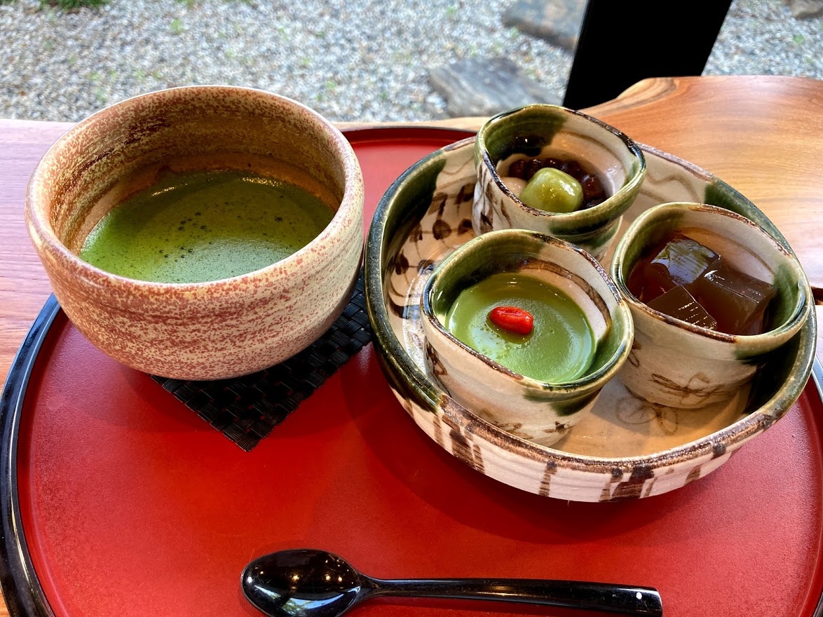 今回は、お抹茶と抹茶杏仁・白玉団子・ほうじ茶寒天のセットをいただきました。