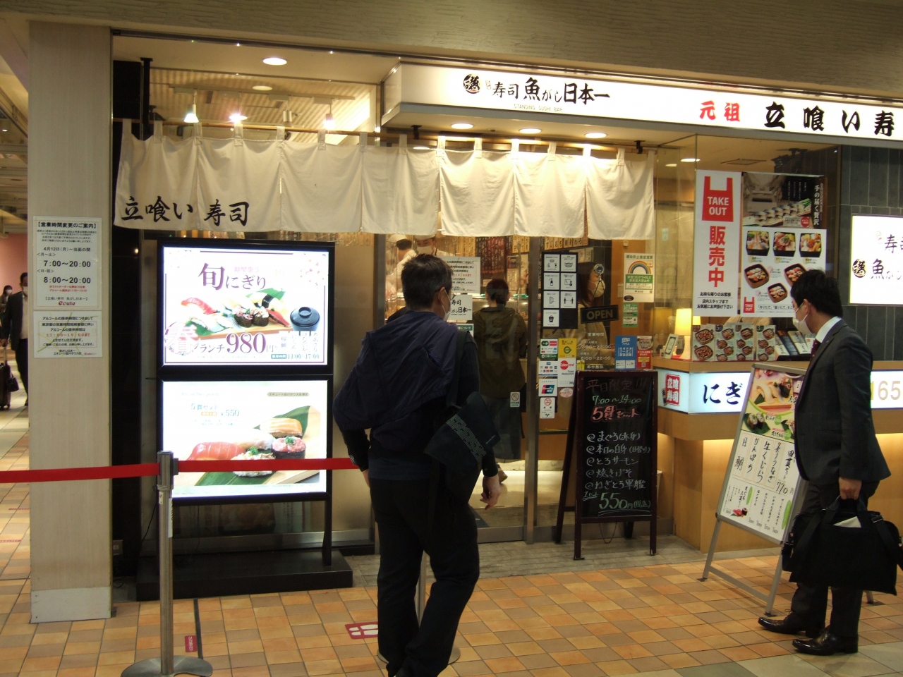 品川駅の改札内、エキュート品川サウスにある立ち食い寿司。昼時は結構混みますが、意外と回転は速いです。お好みでオーダーすると貫ずつ出てきますが、平日の14時までは5貫セットがあり、マグロなど5種類が1貫ずつお得に食べられるのが嬉しいです。