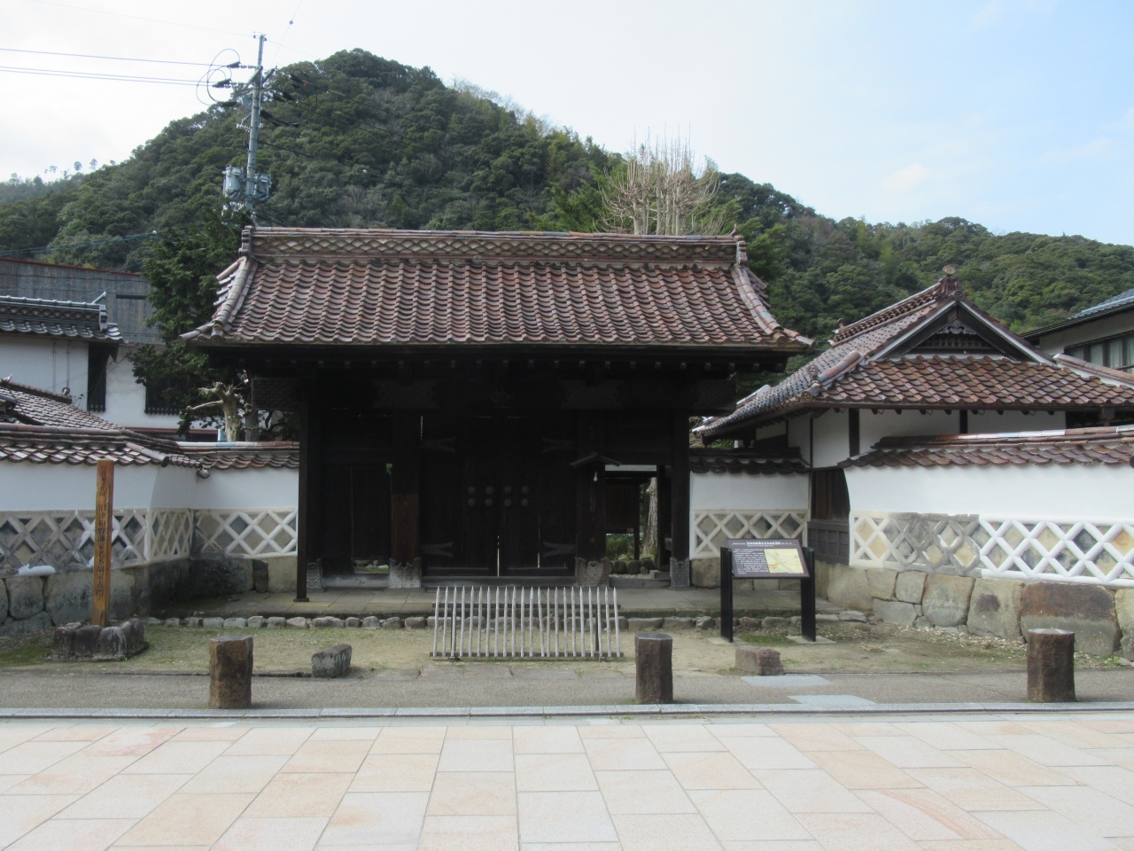 津和野の観光の中心である殿町通りの南端、藩校養老館の向かいにこちらの門があります。通りの両側に続く白壁が少し奥まったところに、瓦屋根を乗せた立派な門が建っています。門のみが残されていて、門の後ろには何もありませんので、西側の1本隣の通りからは門の裏側が見えて面白かったです。
