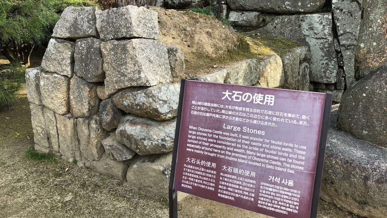 岡山城の石垣は、瀬戸内海の小さな島・犬島などから運ばれたようです。石垣の一部エリアには、大きな石が使われています。これは、当時の大名が、自分の威厳を示すため、巨石で石垣をつくることが流行った名残です。