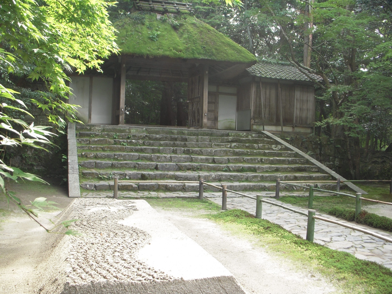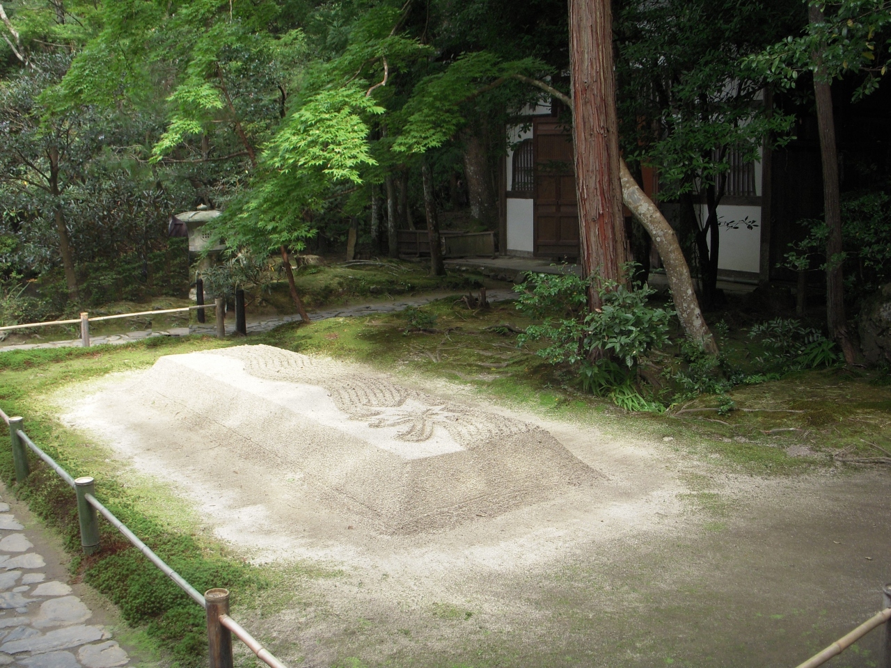 参道をのぼると茅葺きの山門があり、山門をくぐると両側に砂盛りがあって、白砂に文様が描かれています。