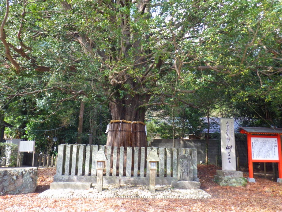 「Hotel&RentaCar660」を出発し、20分ほどで「熊野速玉大社」に到着しました。無料駐車場に車を停め、大鳥居をくぐると、右手に「八咫烏神社」があり、その対面に「熊野速玉大社御神木の梛(ナギ)」がありました。ナキは葉脈が縦に入り切れにくく破れにくいため縁結びの御利益があるとのことです。