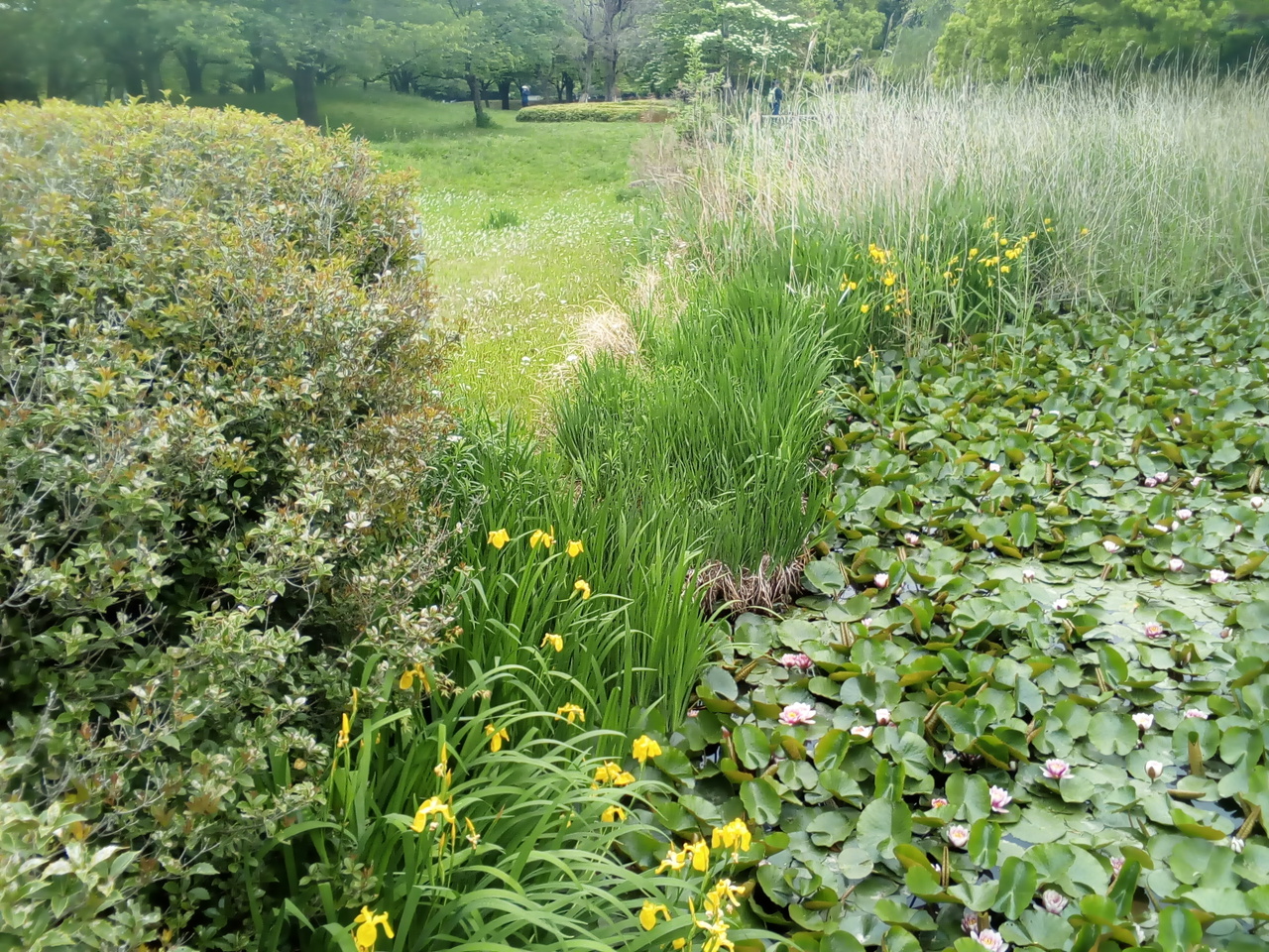 程よい広さの中に釣りができる沼や児童公園、広場があり、散策路も選べます。所々にベンチが置かれているので、テイクアウト品を持った人達が食べながら話してたり、アスレチックで子供を遊ばせてたり。幹線道路沿いとは思えない静かさでした。