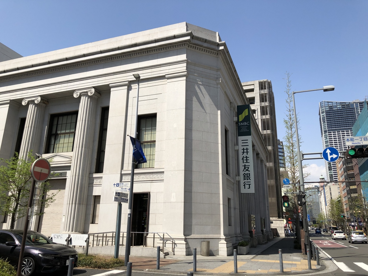 横浜の金融機関が集まっている本町通り沿い、本町一丁目交差点の前にあります。昭和6年にアメリカの建築設計事務所によって設計された建物です。建物の意匠として、正面に4本、側面に2本ある、ローマの宮殿のような柱が特徴的です。