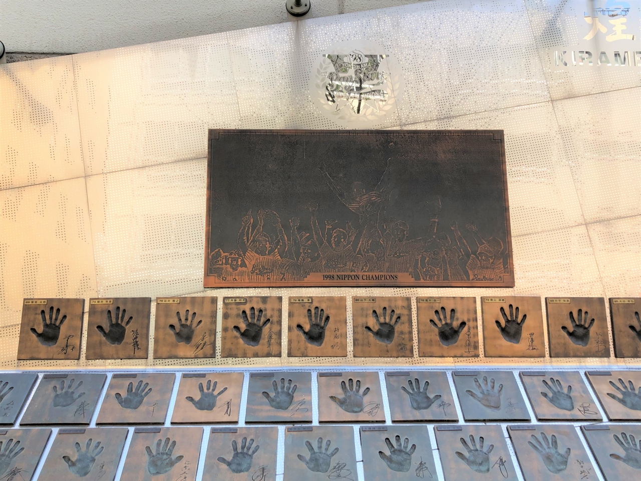 横浜スタジアムから1ブロック入った通りに、横浜ベイスターズが1998年に初優勝を記念してのモニュメントがあります。権藤監督の胴上げの写真を銅板に焼き付けたプレートや、選手40人の手形などからなるモニュメントです。このモニュメントが建てられた通りは、このモニュメントの完成後、ベイスターズ通りと名前を変えました。
