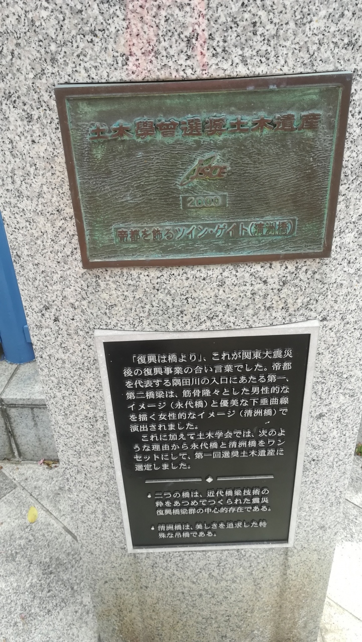清洲橋の名称は、日本橋区町と深川区清洲町の一文字を取って清洲橋になったそうです。