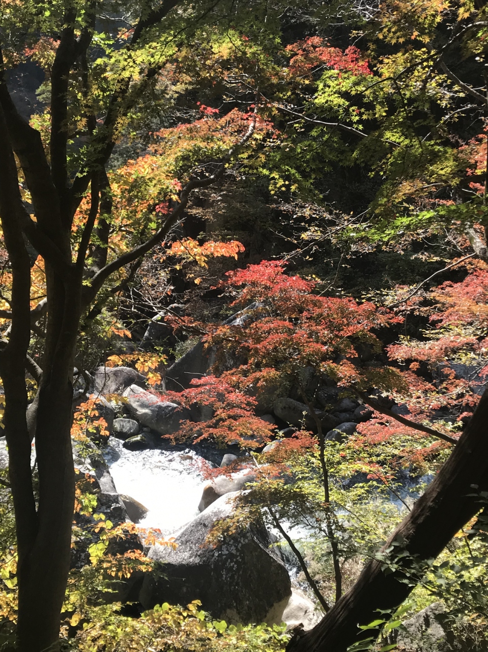 美しい紅葉、その下を流れる白い渓流、岩の渓谷、見上げるようなおおきな岩肌、見応えのある景色が楽しめました。お天気が良く気持ちの良い散策でした。