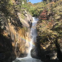 奥の方に滝がありましたが、ちょうど虹がかかって綺麗でした。