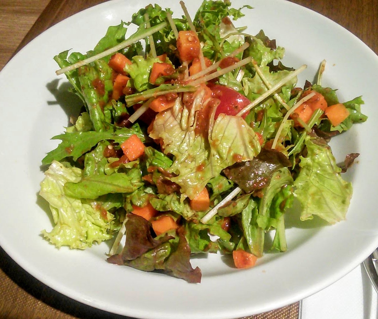 エチカ表参道のフードコートの一画にあるサラダ専門店です。基本となるグリーンサラダに、自分の好みで追加するトッピングやドレッシングを選ぶと、大きなボールの中で、野菜にドレッシングがよくなじむようにトスしてくれます。トマトと大葉のノンオイルドレッシングで、にんじん、トマトを追加しました。トッピングはどれも50円なので、種類を増やすと、金額がかさみ、割高になってしまいます。