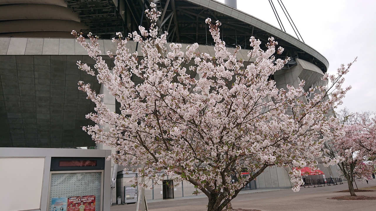 豊田スタジアムを背景に、桜が咲き誇っていました