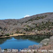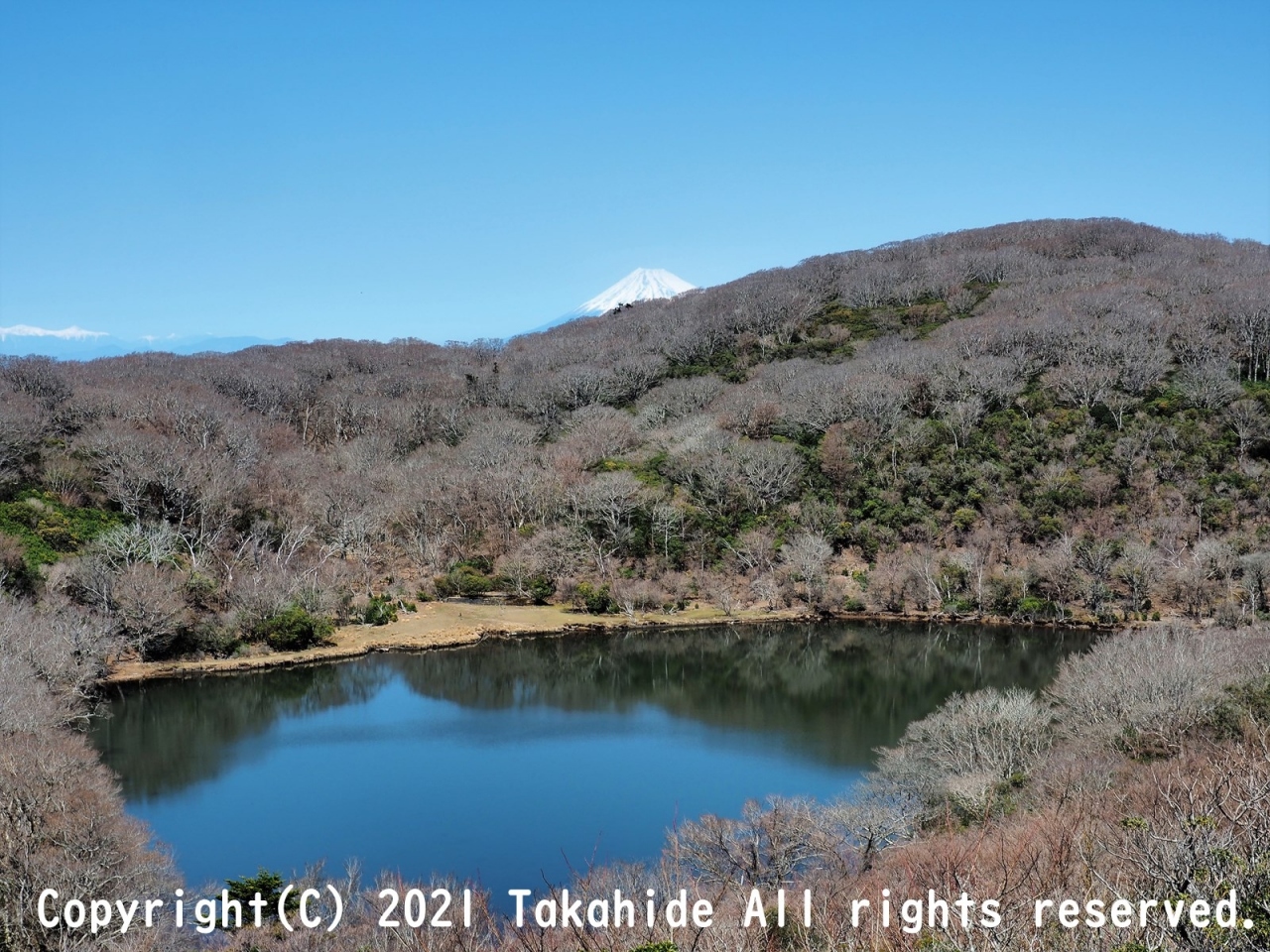 下り御幸歩道だと八丁池手前で池と逆方向、上り御幸歩道だと池の手前に360°見渡すことが出来る展望台があり、池の奥に富士山が見えます。