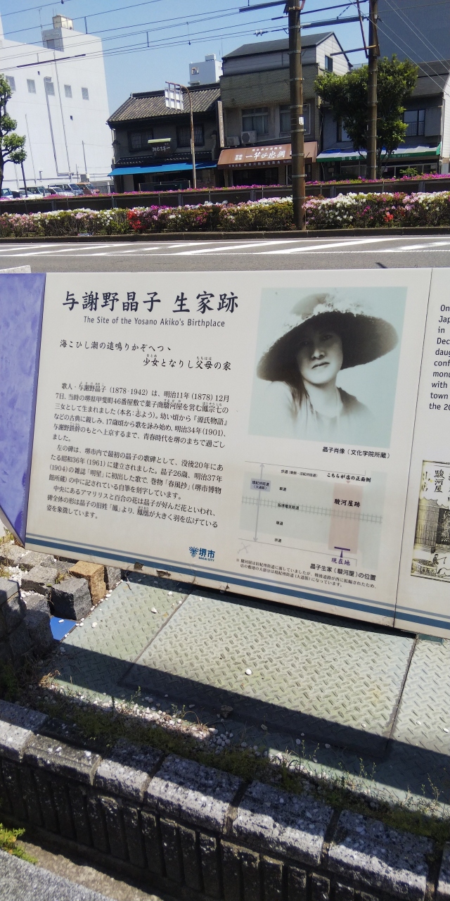 与謝野晶子は堺に生まれ明治・大正・昭和を短歌とともに生きた「情熱の歌人」とよばれています。この生家跡には「海こひし 潮の遠鳴りかぞへつつ 少女となりし父母の家」の歌碑がありました。春に行きましたので花が咲いていてキレイでした。