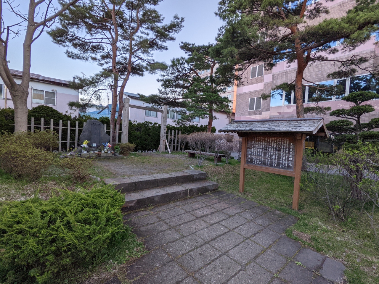 JR函館駅からは約1キロ前後のところで、一本木関門という関所があった場所です。諸説ありますが、かの地で銃弾に倒れたという説が有力なので、観光地となっており、簡単な説明書きと記念碑があります。ファンにとっては感慨深い場所です。