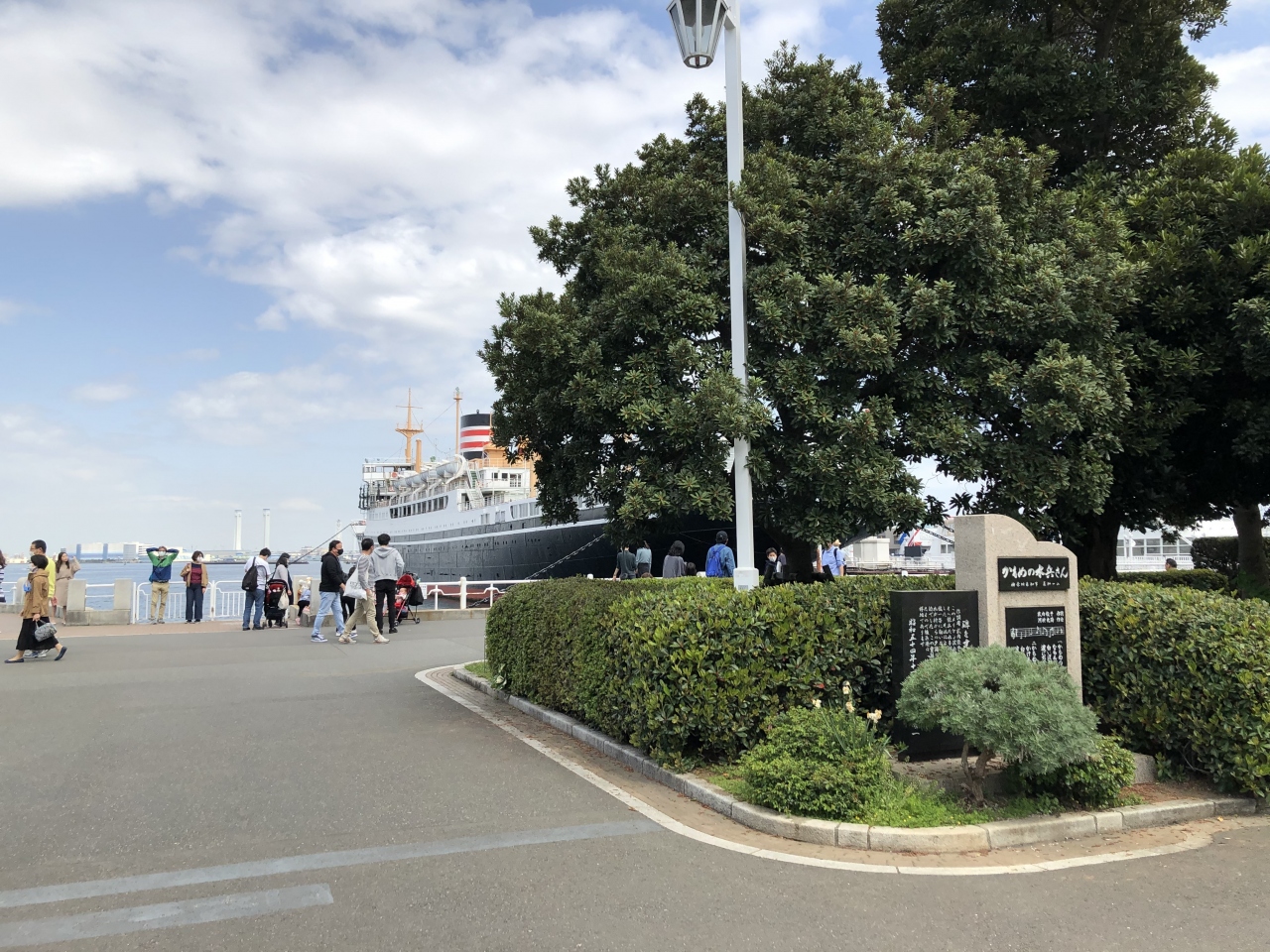 「水の守護神」の噴水近くの植栽の中に、草木に隠れるように石碑があります。石碑の上側の曲線は、カモメが飛んでいる姿のようです。石碑には、かもめの水兵さんの楽譜(最初の4章節)と、歌詞(1番と2番)が記されています。