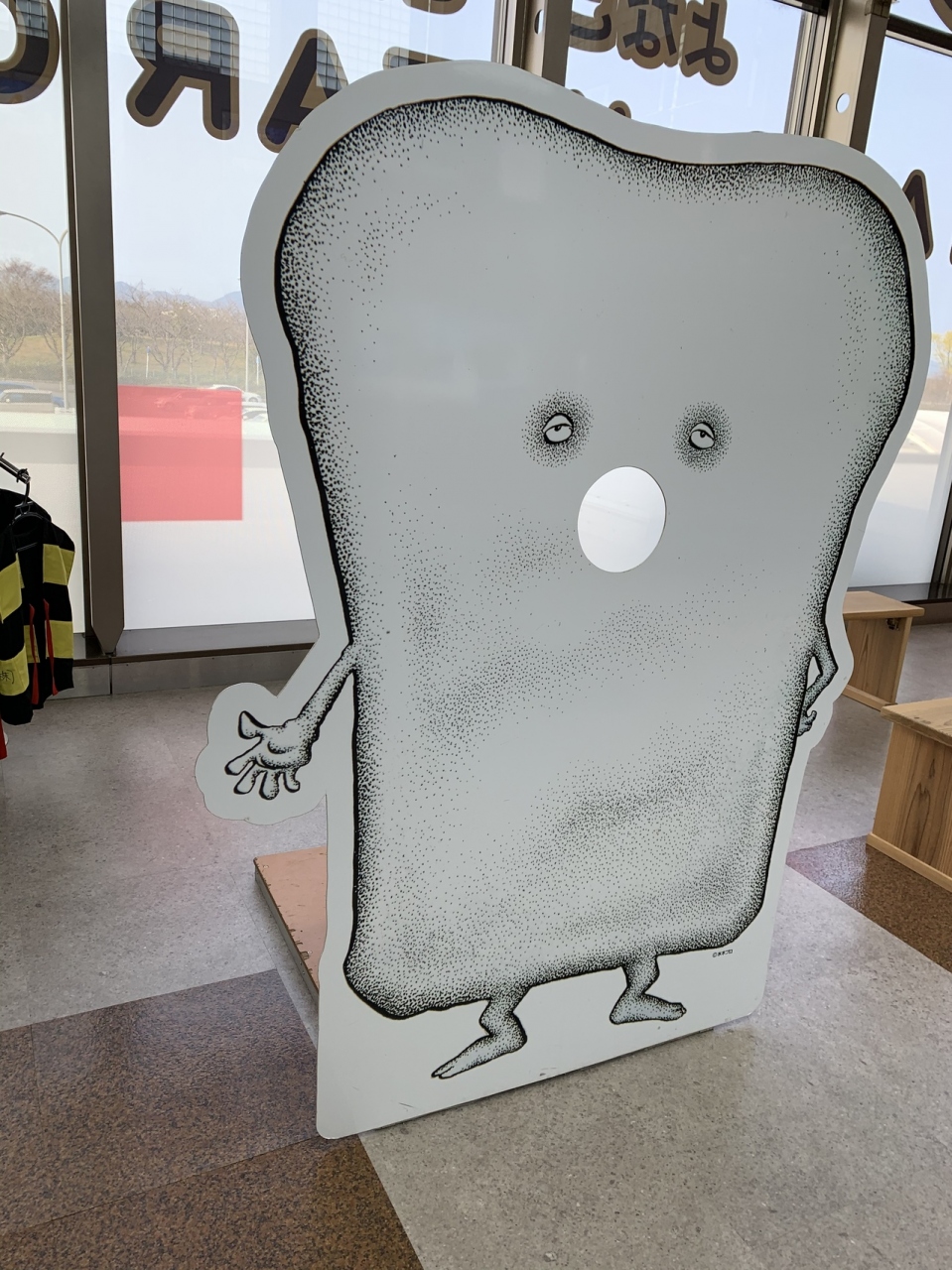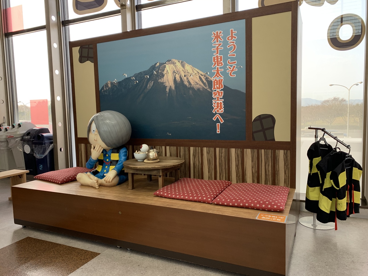 空港の開けたスペースには鬼太郎の記念写真スポットが設けられていて記念写真を撮るのにぴったりです。鬼太郎になりきれるちゃんちゃんこが用意されていました。3サイズ用意されていたのでお子さんから大人まで楽しめます。
