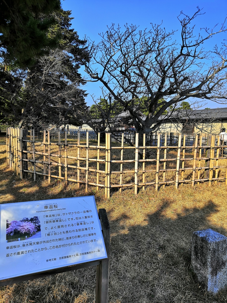 中立売御門からそのまま東に行ったところにあります。説明文があり、そこにも書かれているように、後水尾天皇が牛車で外出されたとき、この桜があまりにも美しかったので、車を返すように命令され鑑賞されたからだそう。さすがに時期的に咲いてませんでしたが、写真などを見ると綺麗なんでしょうね。