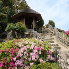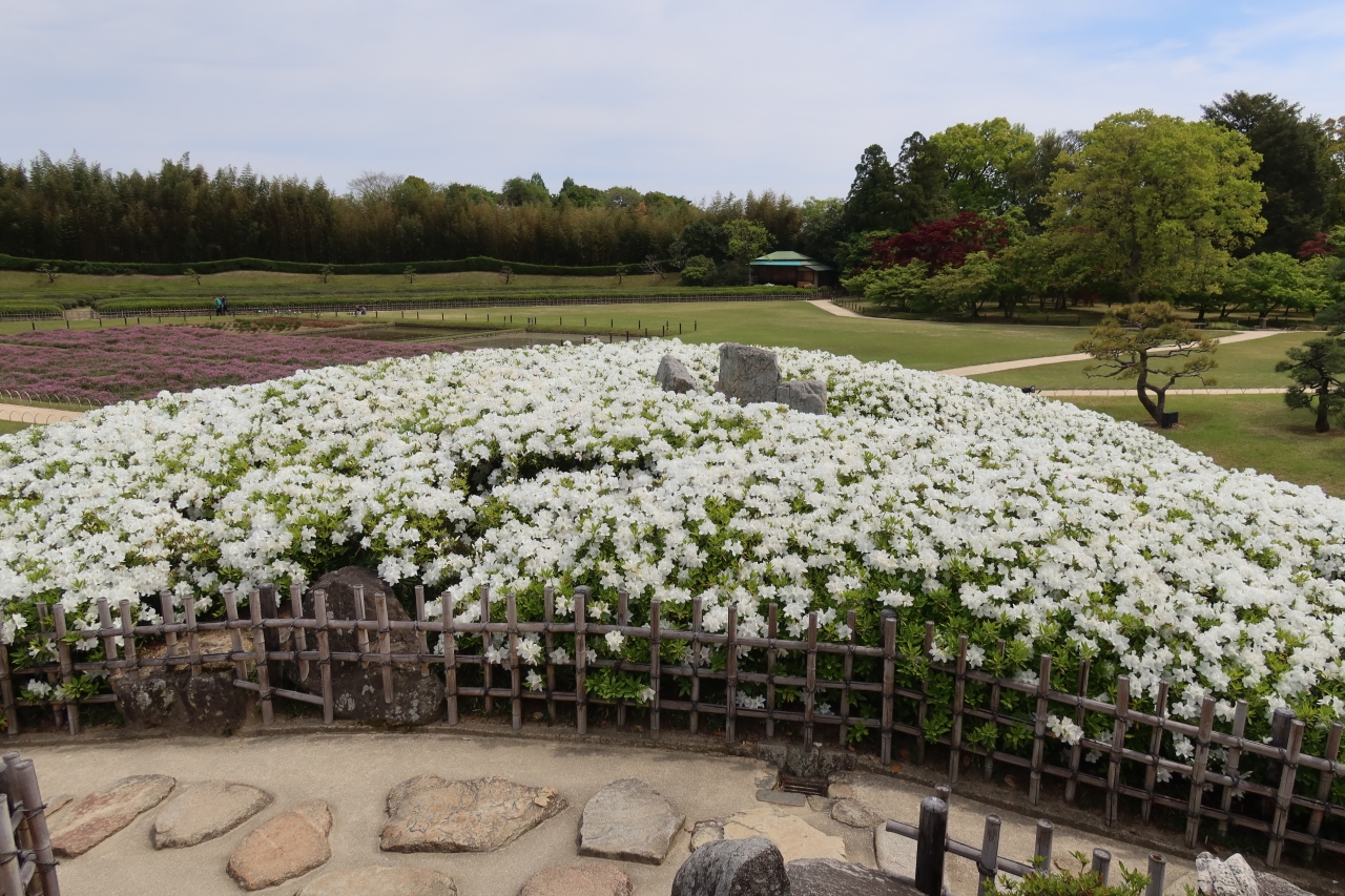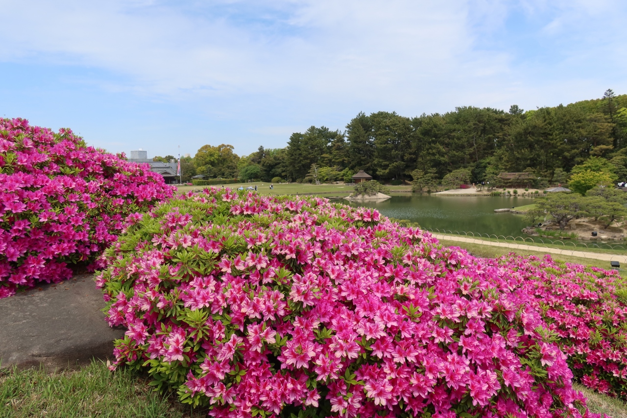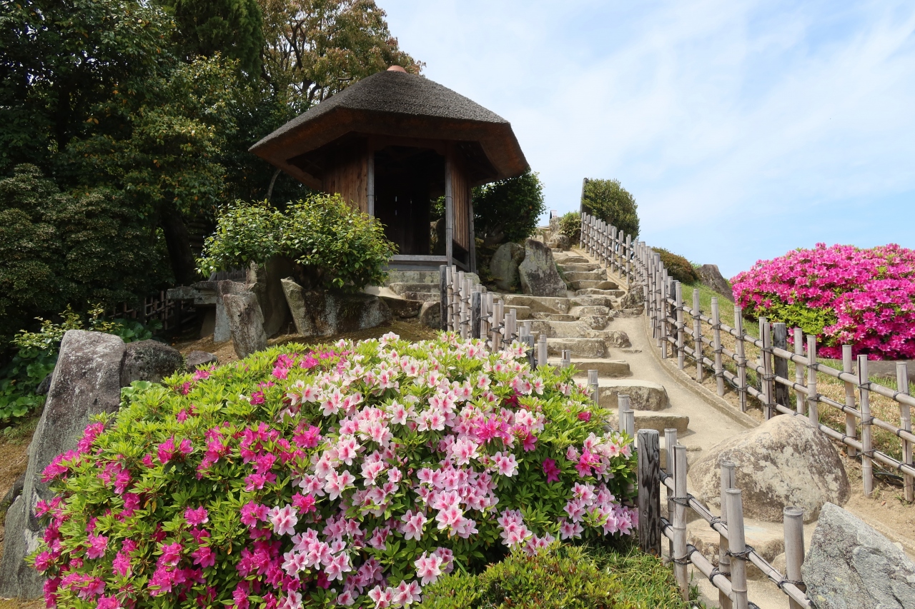 岡山後楽園のほぼ中央に築かれた小山が唯心山です。池田継政が築いた唯心山の山頂からは後楽園のほぼ全体を見渡すことができます。また訪れた4月末には、唯心山の周りにはつつじの花が咲き誇りとても見事な景色を見ることができます。