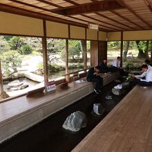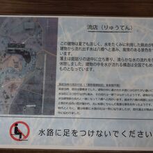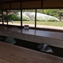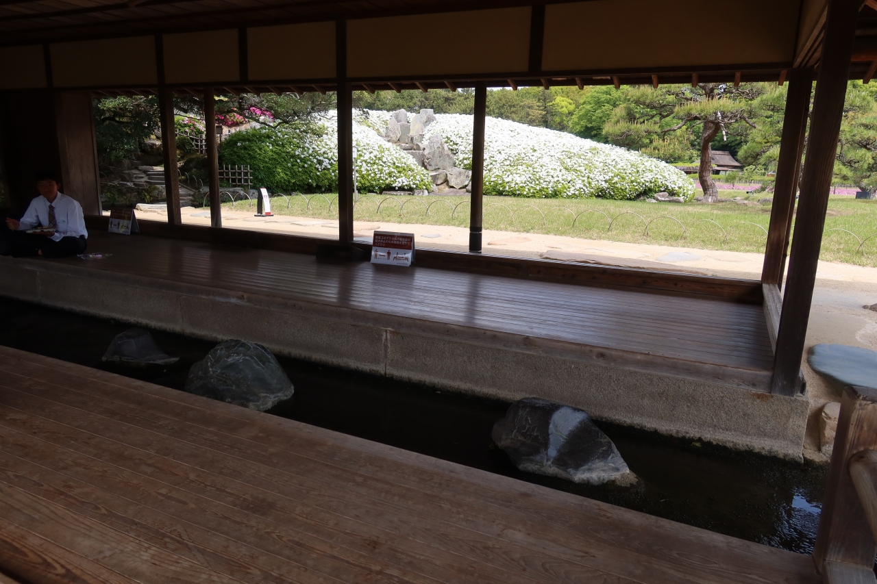 岡山後楽園のほぼ中央にある唯心山の傍にある建物が流店です。この建物は後楽園の中でも特筆すべき珍しい建物で、建物の中を水が流れることで有名です。それを楽しみに行ったのですが、行ってみると、あれ、石床が濡れているだけで水が流れていません。水が枯れて、修学旅行生が足を下して弁当を食べていると言う悲しい風景が見られました。