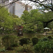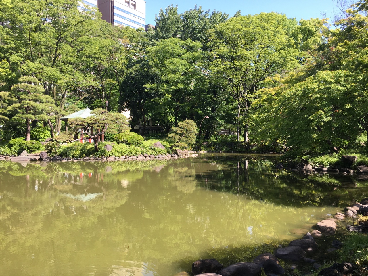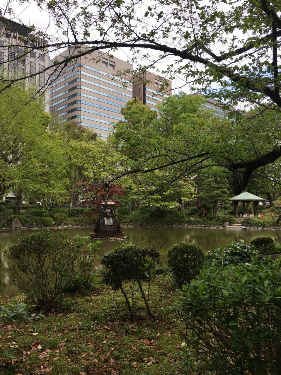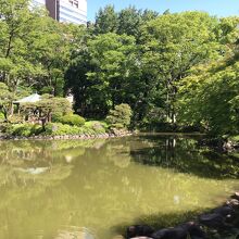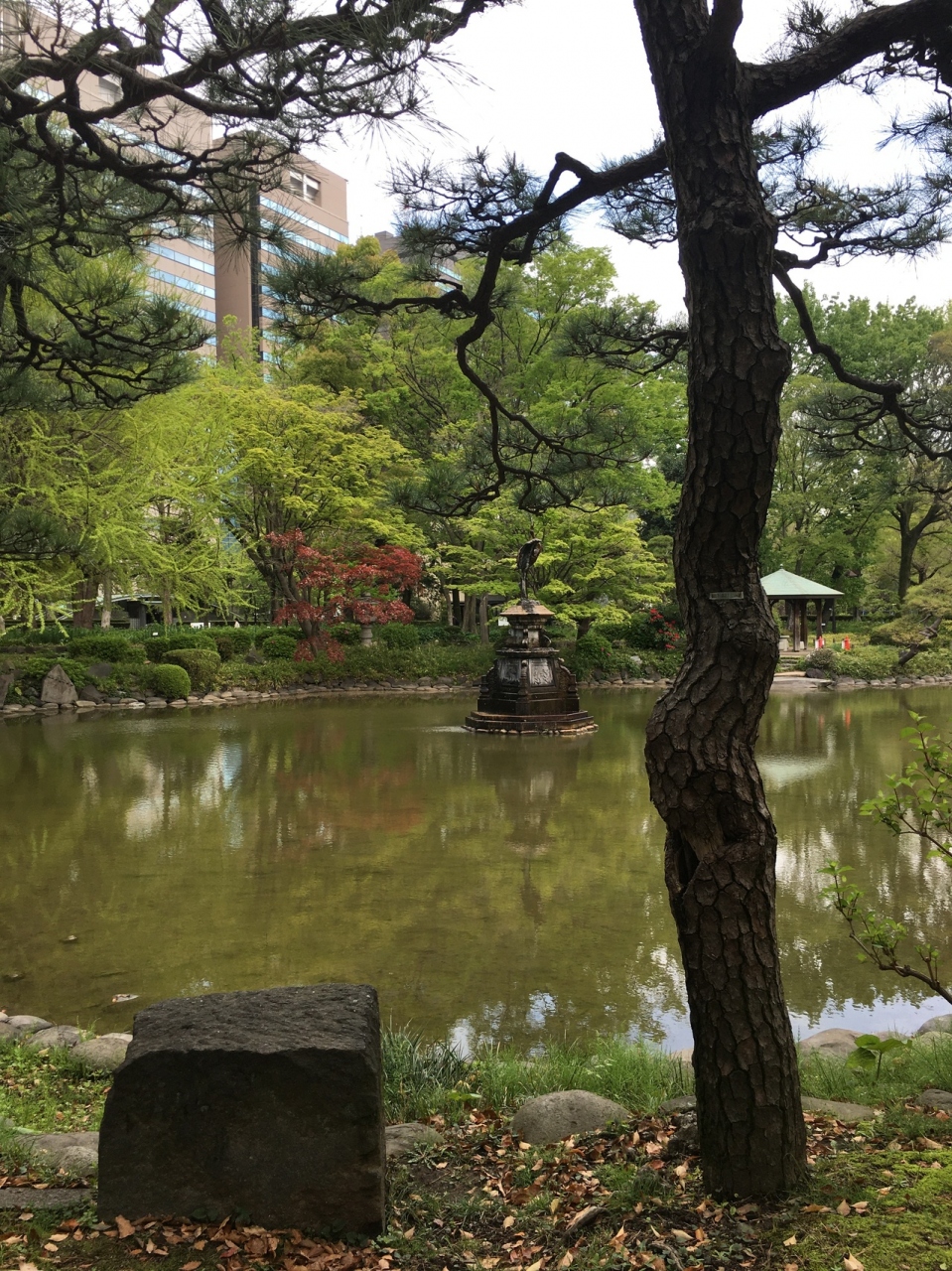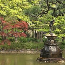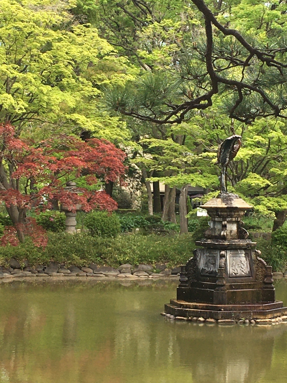 一周5分ほどで池の周りを歩くとことが出来、途中ベンチがいくつかあったので池を見ながら休みました。対岸には東屋のような休憩場もありました。周辺は新緑に囲まれていたので、池に木々が反射していました。鶴の噴水が池の中にあります。