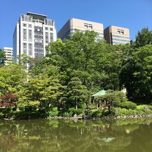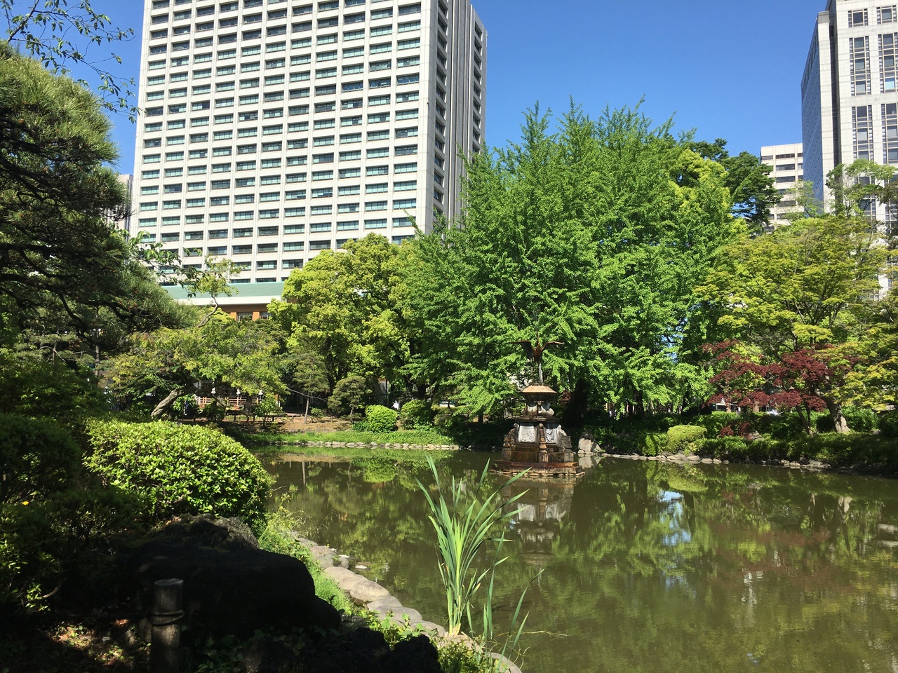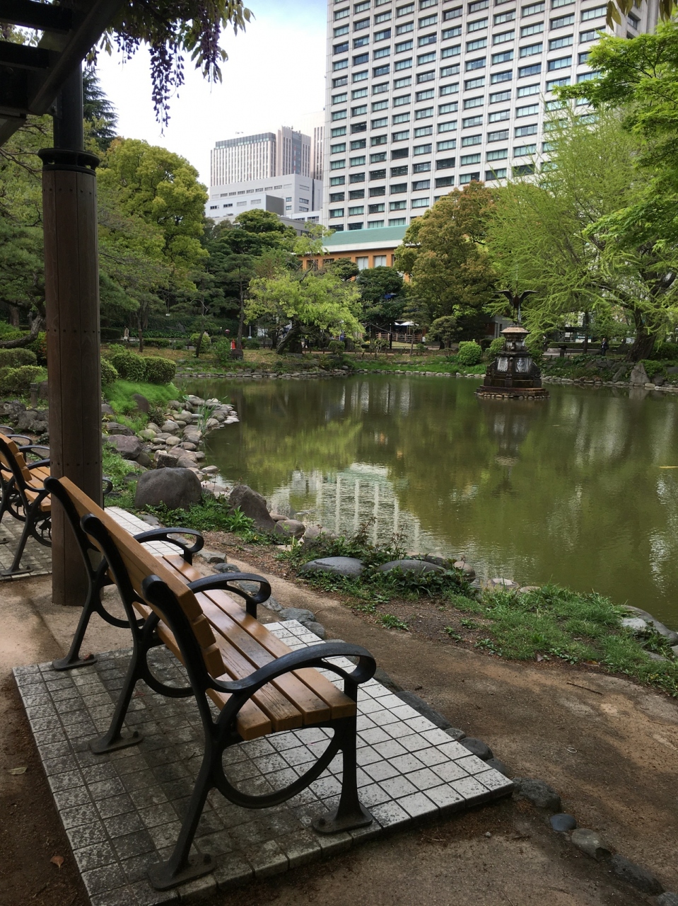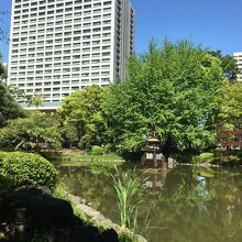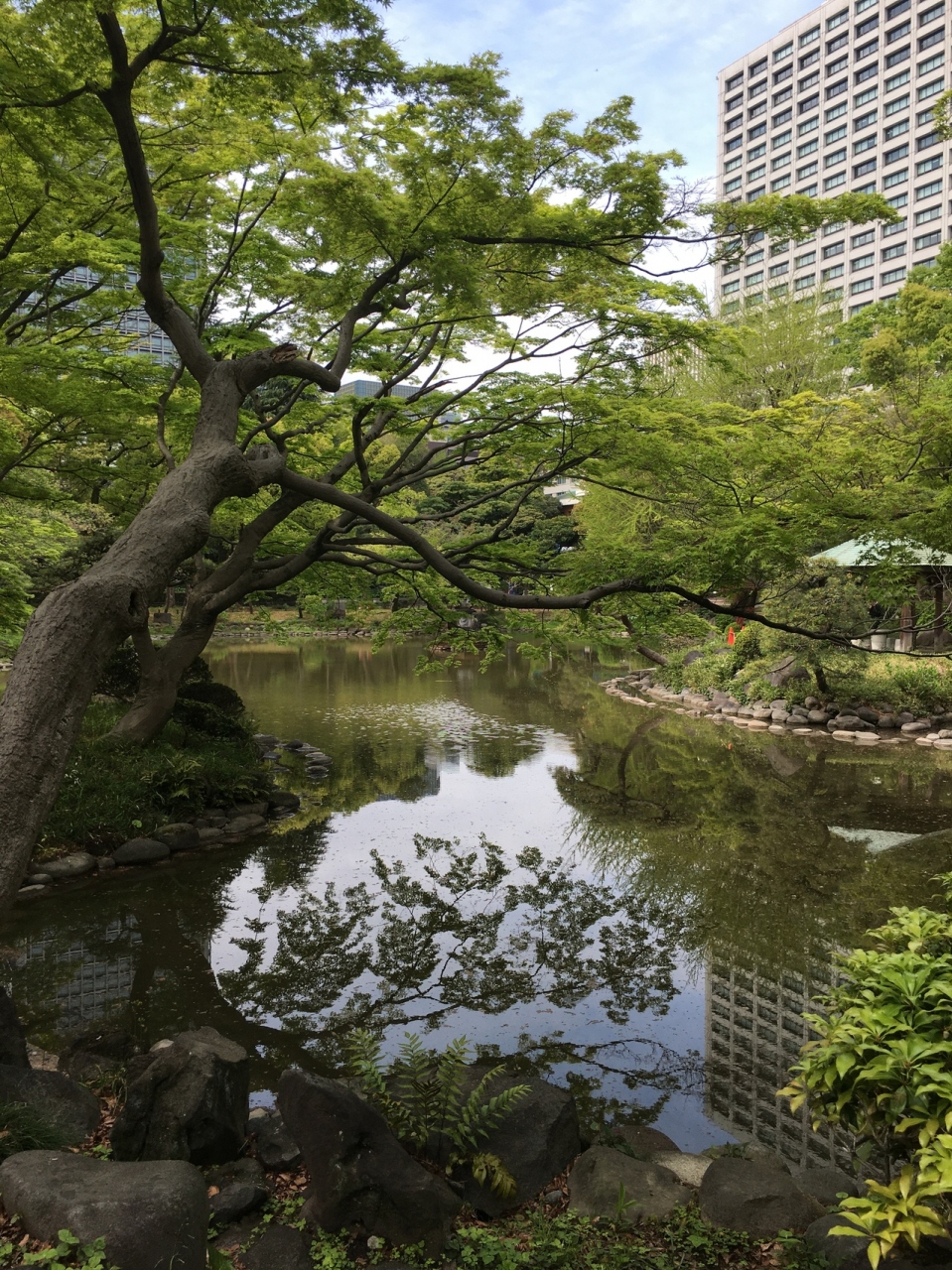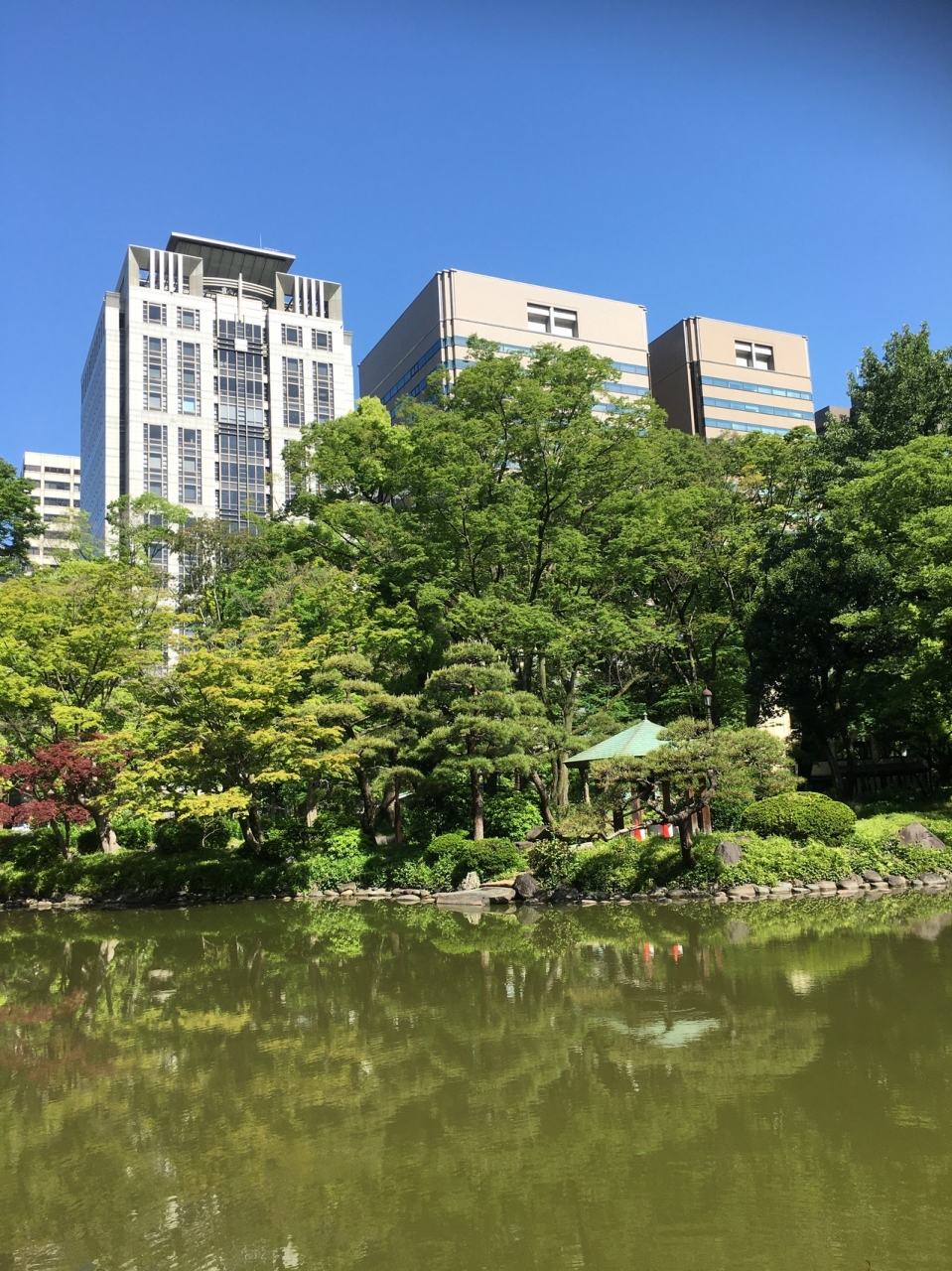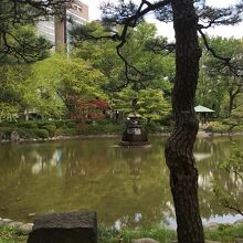 一周5分ほどで池の周りを歩くとことが出来、途中ベンチがいくつかあったので池を見ながら休みました。対岸には東屋のような休憩場もありました。周辺は新緑に囲まれていたので、池に木々が反射していました。鶴の噴水が池の中にあります。