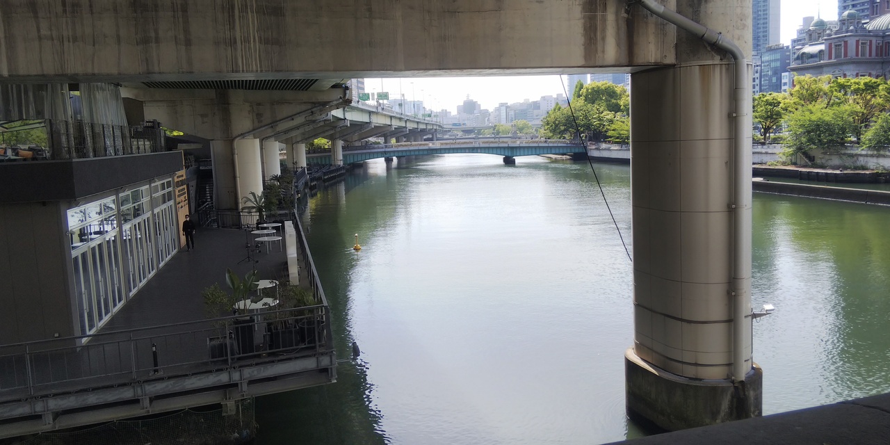 中之島 ラブ セントラルは中之島の北側の対岸で、裁判所のすぐ南側にある複合型施設です。堂島川沿いにウッドデッキを張り、オシャレなレストランやリバークルーズの乗船場などがあります。朝9時前ぐらいに行きましたので、まだお店も空いていなくて静かでした。