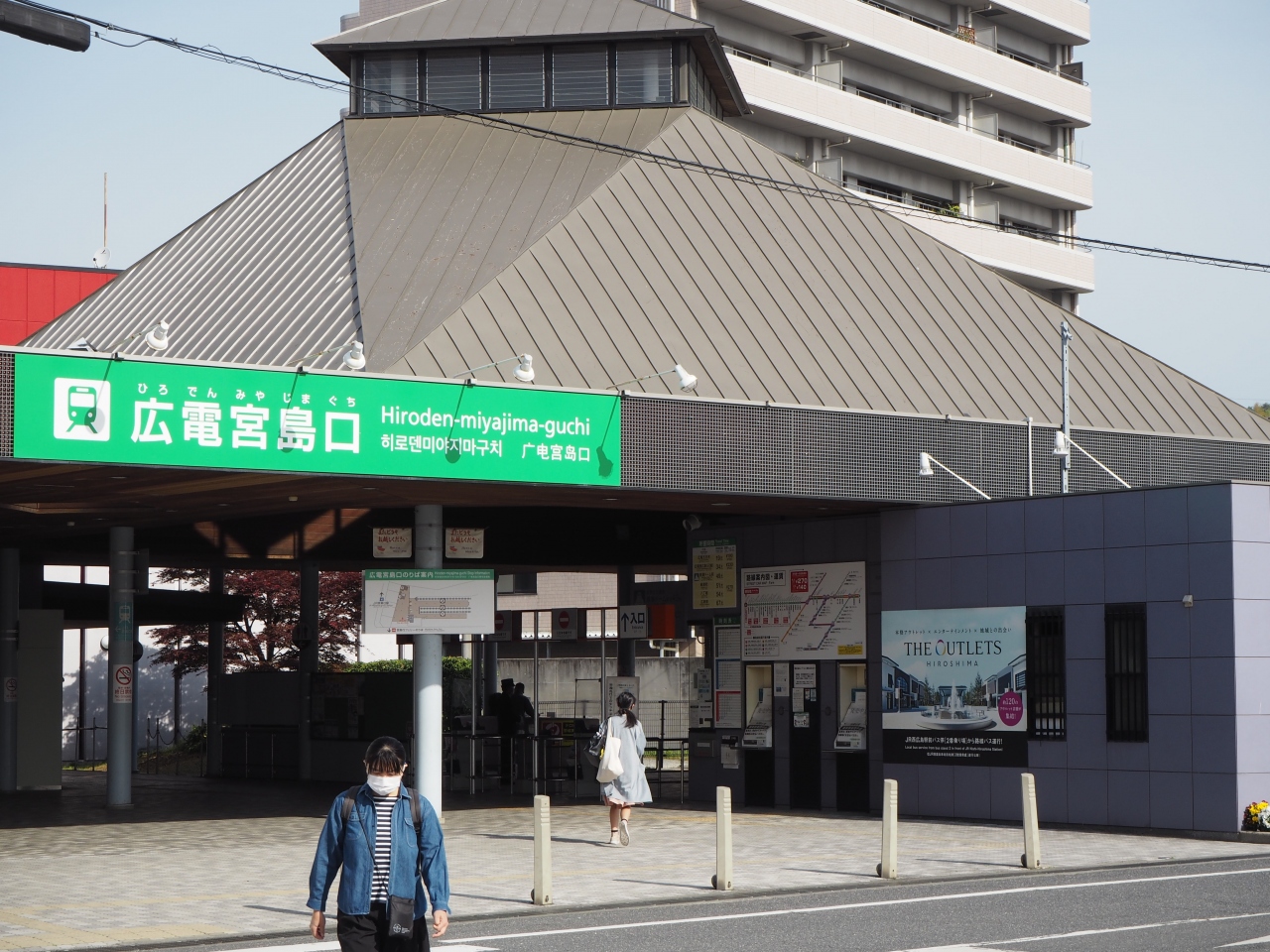 広島市街地で路面電車で走っている広電が広島市街地中心部から宮島口まで電車を運行しています。時間はJRよりかかりますが、市街地中心部からの移動の時はこちらからも便利です。宮島口を出ると宮島口桟橋まで歩いて3分ほどです。