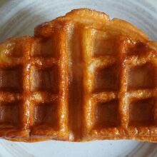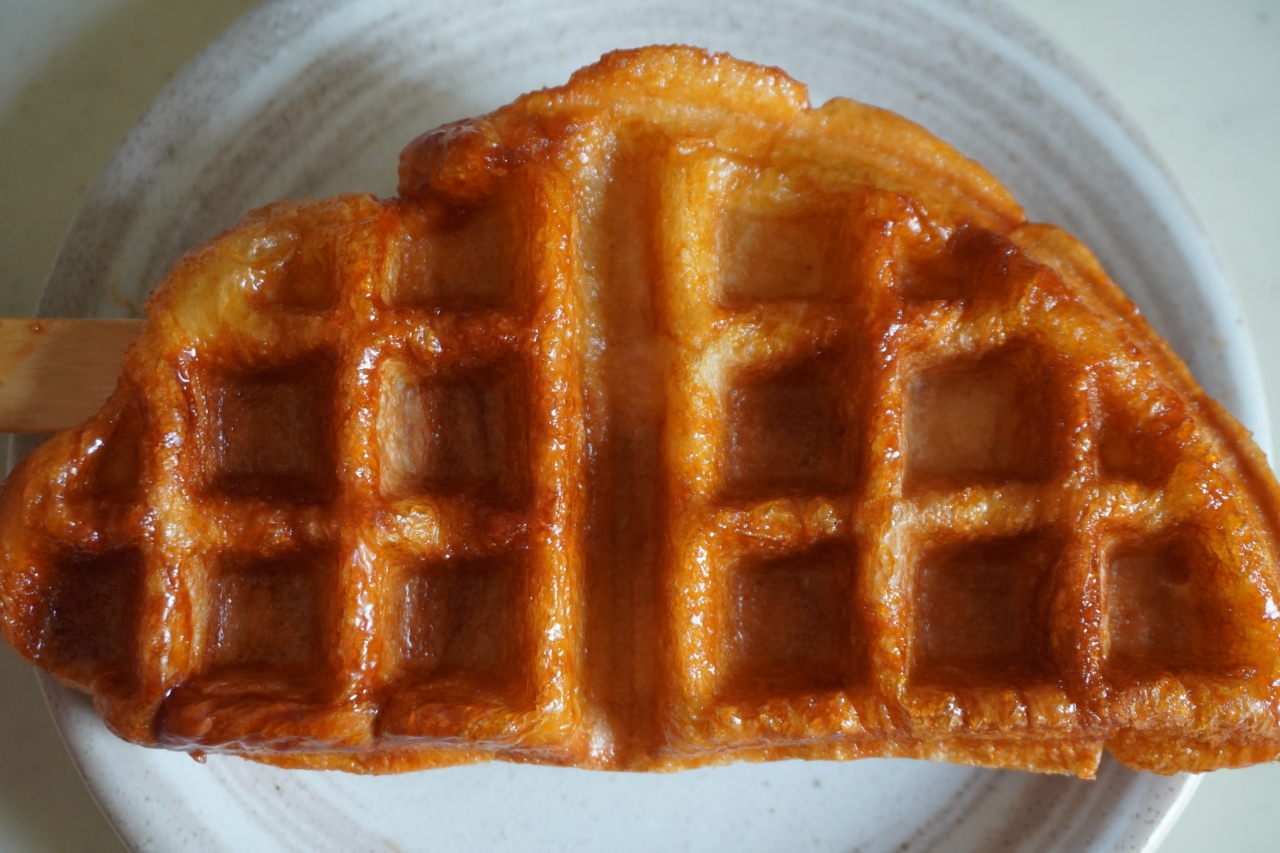waflaは、クロワッサンの生地をワッフルマシンでプレスしたクロワッサンワッフルの専門店。アイスみたいに木のバーに差してあって、これも独創的ですね。プレーンの味は、ハチミツと焦がしバターかな。スイーツとしては素直なおいしさなんですが、値段的にはちょっとお高めかなあと感じます。