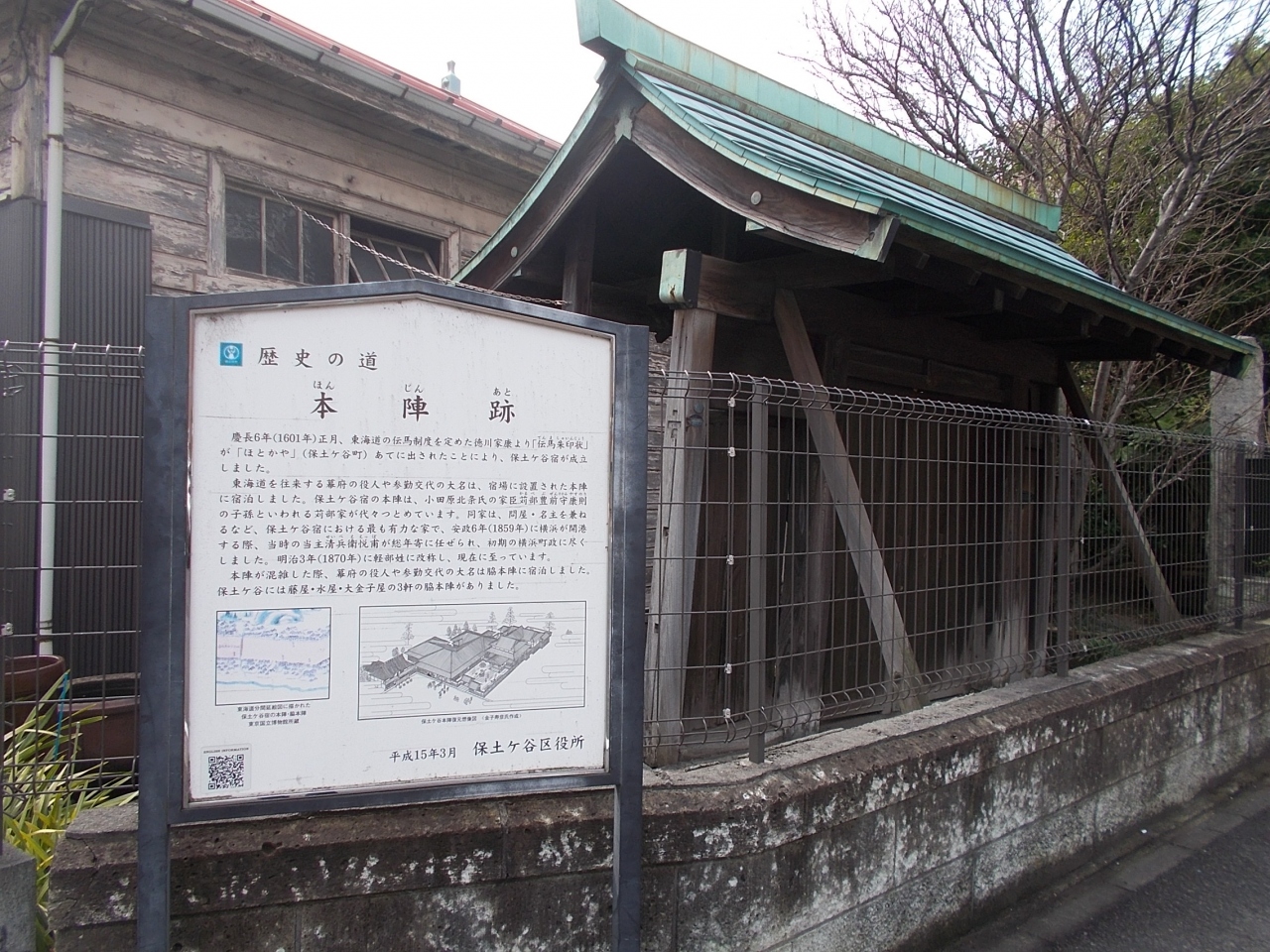 この保土ヶ谷宿本陣跡は旧東海道保土ヶ谷宿の中の比較的京よりのエリアにあります。東海道が東西から北に大きく曲がる場所にあります。軽部家が本陣を務めていたのです。その軽部家の敷地内にかつての門が残ています。国道沿いから見ることができます。当時の実力者の面影を見れます。