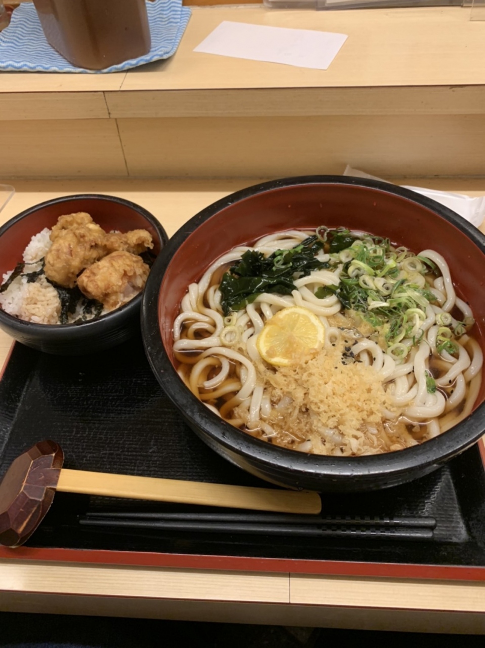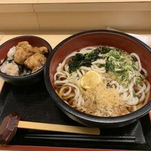 ハイハイタウン地下1階にある美味しいおうどんのお店です。店頭に消毒スプレーが置いてありました。おうどんと、鳥丼のセットを注文しました。炭水化物祭りです(汗) 提供時間はとても早くて、さっと美味しく頂きました。