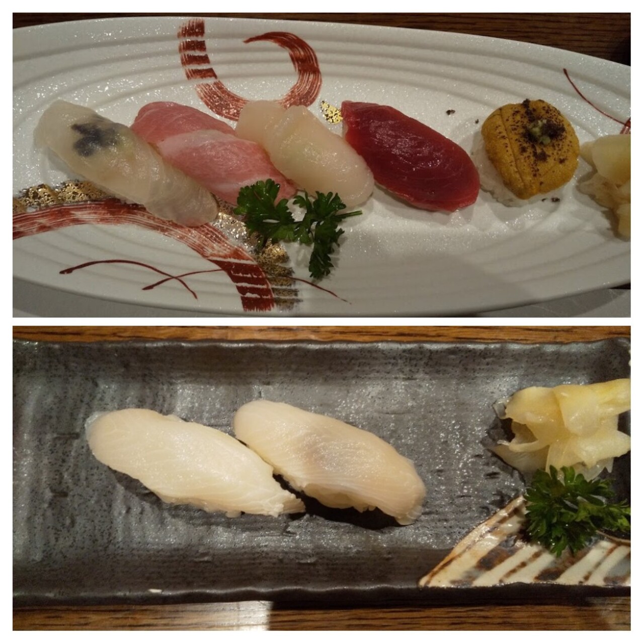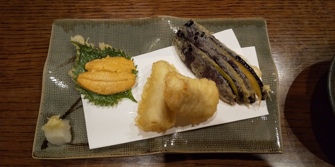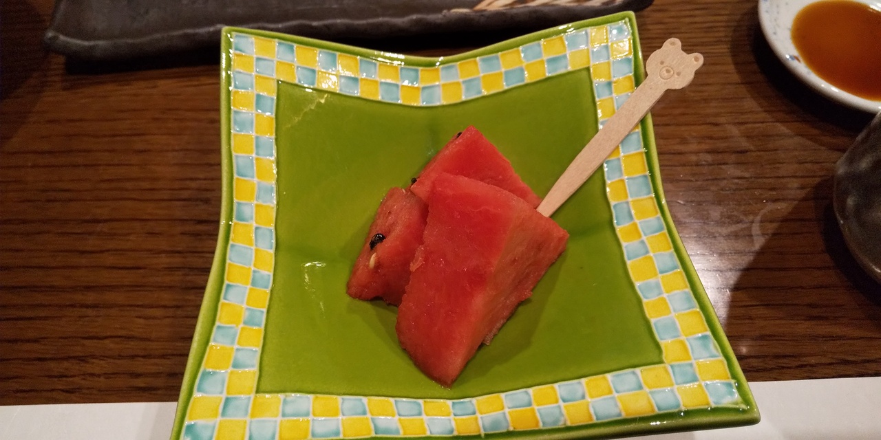 気仙沼の魚がメインのコースで、先付は茶碗蒸し、もずく酢、ホタテ。お造りに鰹やマグロもありましたが初めてたべたのがサメの肝。牛レバー刺のような感じでした。天ぷらは大葉に乗ったウニとサメ、ナス。焼き物はこちらも初めてのメカジキのハーモニカ。寿司はにぎり5貫以外にサメもでてきました。後はお吸い物とスイカでお腹いっぱい!