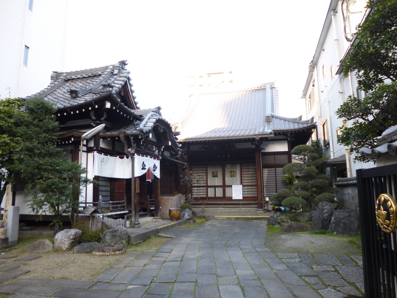 稲荷町の交差点から南東方向に50メートルほどの場所に日蓮宗寺院の経王寺があります。境内は狭いですが、正面に本堂、本堂に向かって左側に「日朝堂」という二つの建物があります。さほど特徴のないお寺ですが、本堂、日朝堂とも、屋根の造りが興味深く感じました。