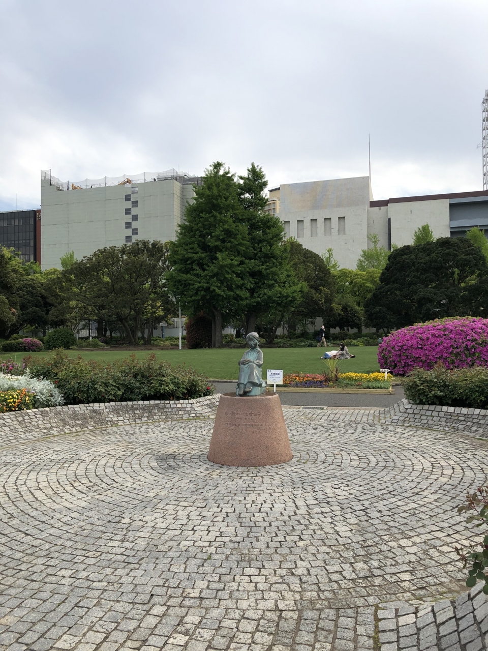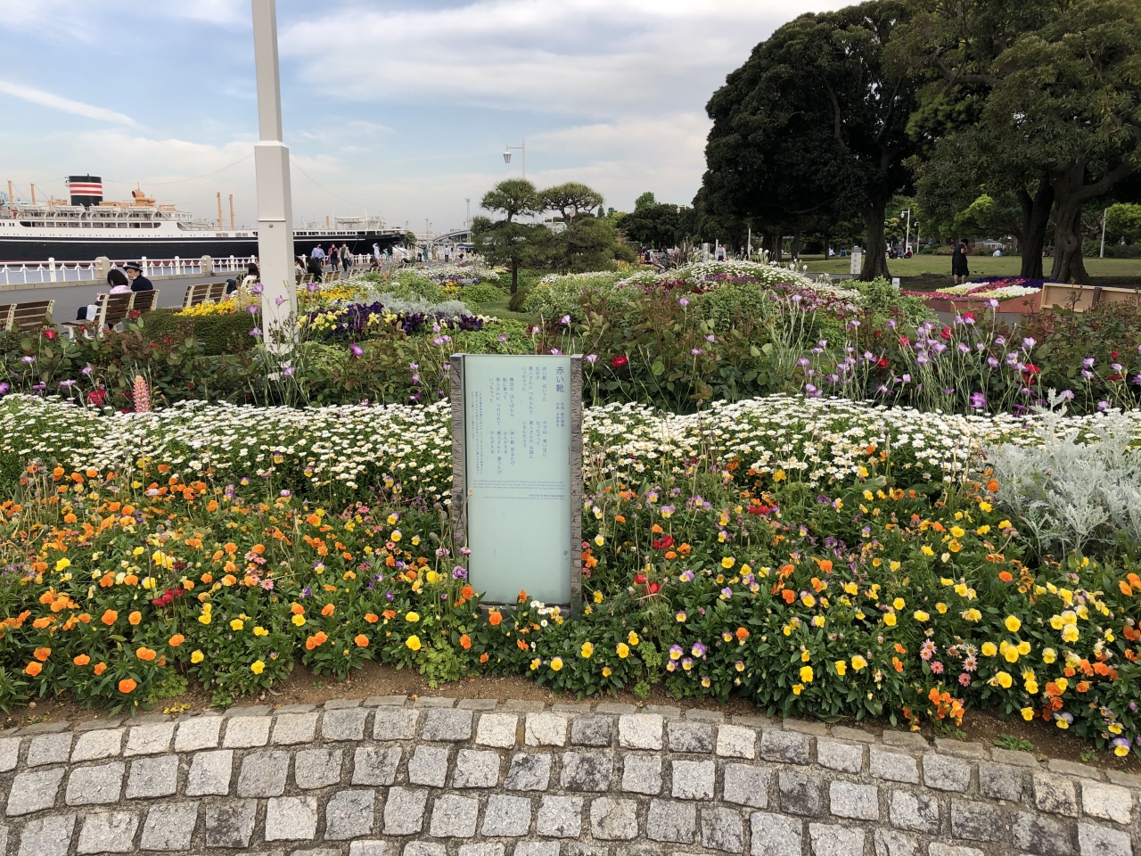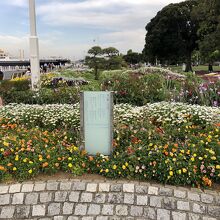 女の子が座って海を見ている銅像です。円形の小広場になっていて周囲には花がきれいに咲いていました。花壇には童謡「赤い靴」の歌碑もありました。山下公園の写真スポットのひとつですね。静岡や北海道でも赤い靴の銅像や歌碑がありましたが、これが元祖という感じがします。